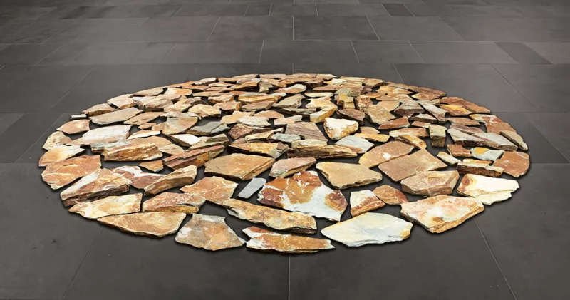 Long made his first stone circle while walking in the Andes in 1972 and has since made similar works in places as diverse as Japan, Malawi, Alaska and Ireland. His account of his attraction to the form underscores its universality: ‘A circle, a line: they look good, they are abstract, they are common knowledge. They belong to everyone and equally to the past, the present and the future’ (1982). Developed for a museum context, this work comprises 134 stones of Cornish slate, sourced from a quarry and exhibited in a five-metre diameter directly onto a gallery floor. The pieces of chromatically similar stone are closely spaced but do not touch.
