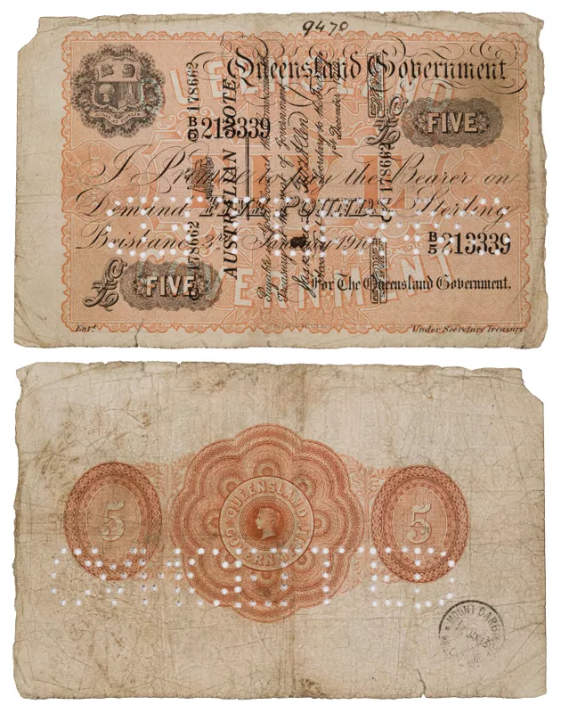 Superscribed Note. Commonwealth of Australia: Queensland Government five pounds C178662 & B/5 213339