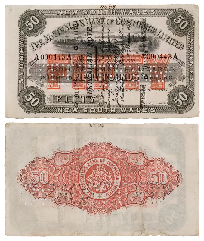 Superscribed Note. Commonwealth of Australia: The Australian Bank of Commerce Ltd fifty pounds G011728 & A000443A