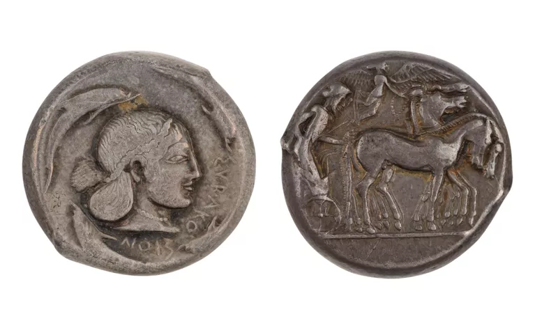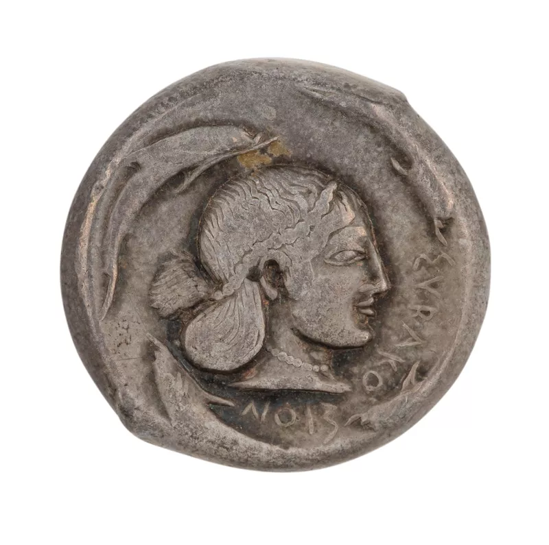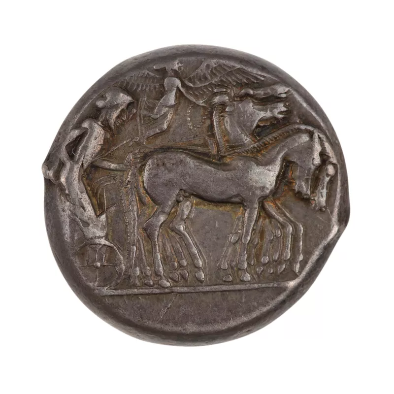 - Obverse: head of Artemis-Arethusa right, dolphins inscription. Reverse: chariot to right, being crowned by Nike.