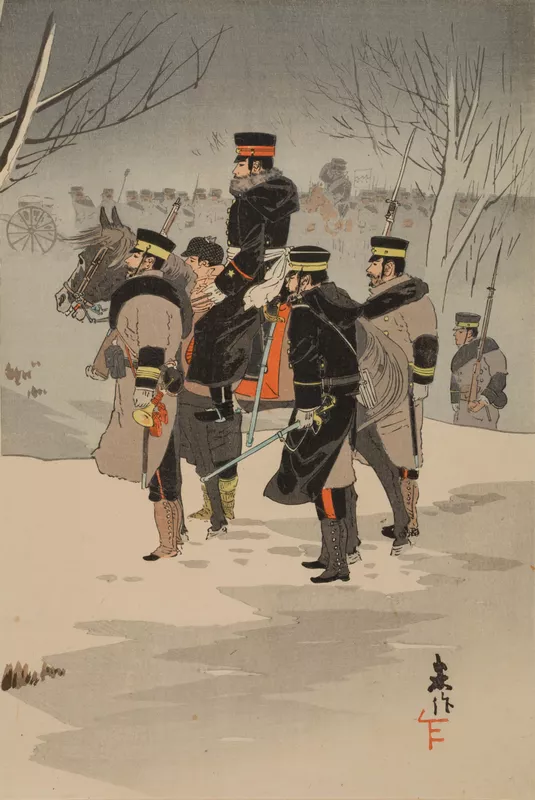 The Japanese Army on Its Righteous Mission to Chastise China Fights Furiously at Haicheng in the Snow and Ice (Sei Shin gigun Kaijō seppyōchū no gekisen Oshima shōshō yūsō taiteki no zu)