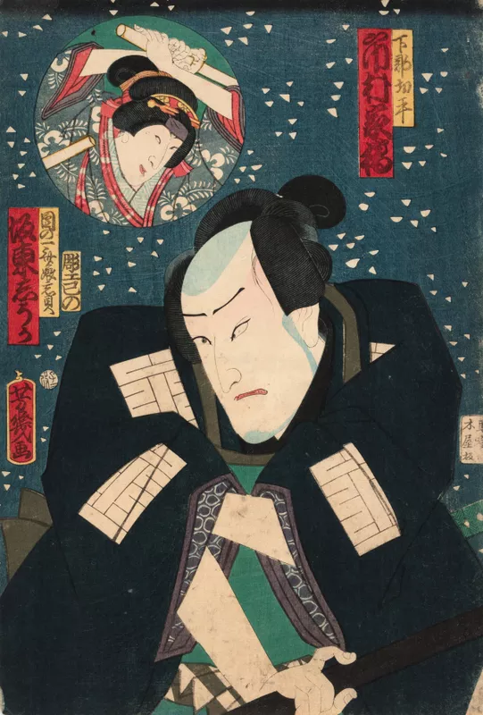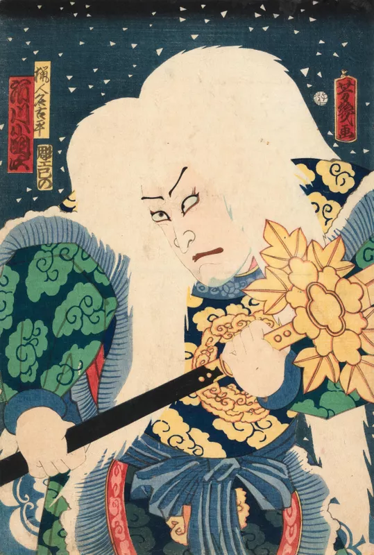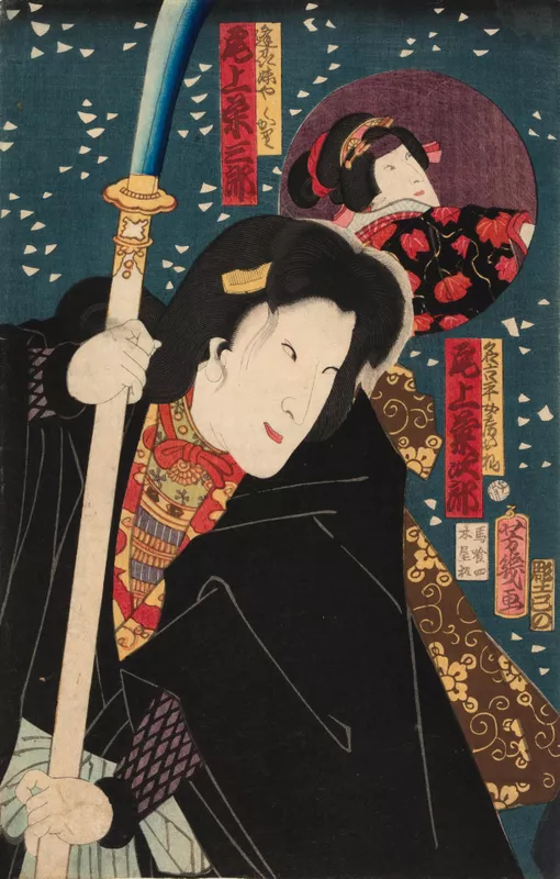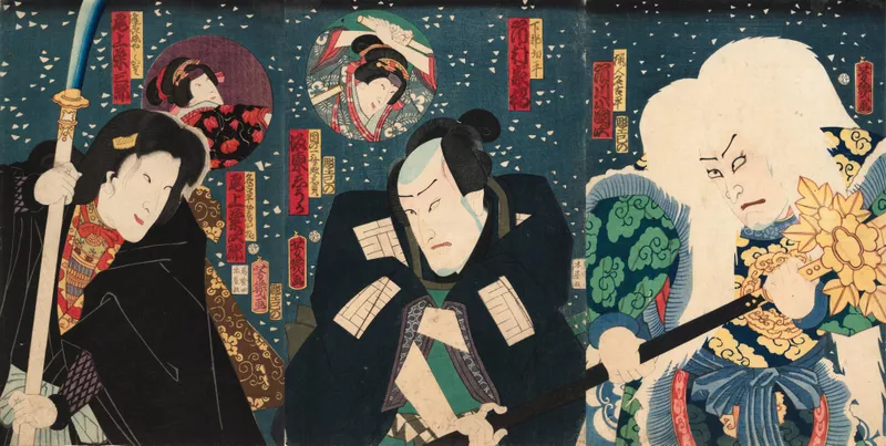 The kabuki actors (right to left) Ichikawa Kohei as The Hunter, Onoe Kikugoro II as Gosho no Gorozo, and Osen as Nagohei's wife from the play Soga Moyō Tateshino Goshozome
