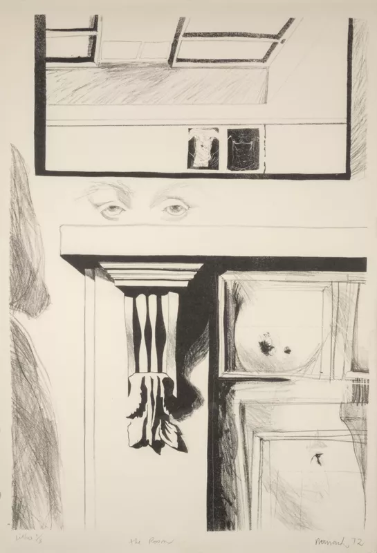 Ann Newmarch’s works of the late 1960s and early 1970s were concerned with the human body, with sexuality, sensuality, voyeurism, and relationships between men and women. Both the naked body and the window emerged as key motifs in the compositions. This print is which body parts are glimpsed through windows, relates to her window series of 1972, where she explores the internal space of the home in relation to the facade or external space of the home.