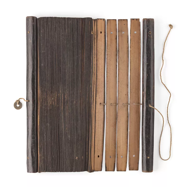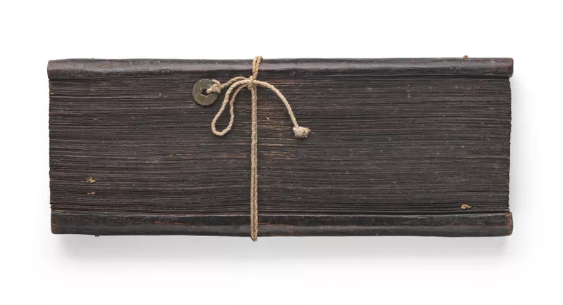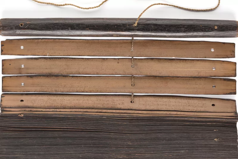 - wood, (lontar) palm leaves, black pigment, cord and Chinese brass coin, 210 folios