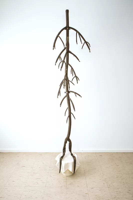 In Icelandic folklore, a witch has the ability to morph into an elder tree and stretch her long branch arms into barns at night to milk cows dry. Thief depicts an anthropomorphic tree attempting to reach into a milk bucket, which is protected by an Icelandic symbol known as the ‘butterknot’.