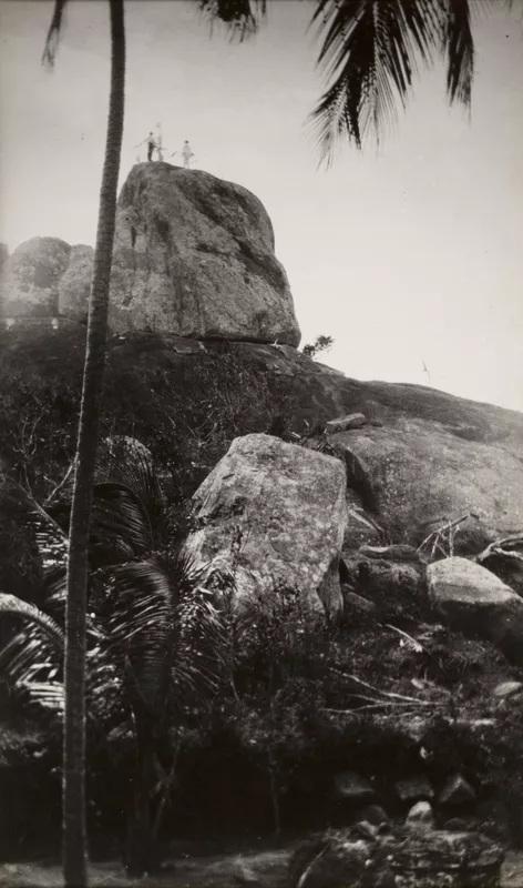 (Tropical landscape with figures on top of rocks)