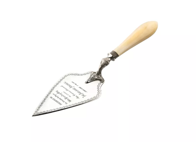 You're in: Home Art & Artists Collection Search Works Trowel Trowel Trowel c.1885 silver, ivory Details Place made Adelaide Medium silver, ivory Dimensions 32.3 x 9.3 cm Credit line Gift of Mr F L Bundey 1952 Accession number 863A72A Media category Metalwork Collection area Australian decorative arts and design Print this page