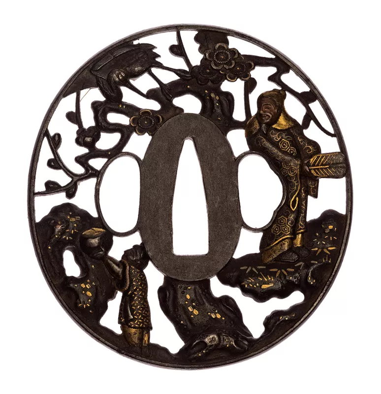 You're in: Home Art & Artists Collection Search Works Tsuba, a holyman under a flowering plum tree and boy with a bowl in his out-stretched arms Tsuba, a holyman under a flowering plum tree and boy with a bowl in his out-stretched arms Japan Tsuba, a holyman under a flowering plum tree and boy with a bowl in his out-stretched arms early 18th century iron, gold-copper alloy (shakudō) Details Place made Japan Medium iron, gold-copper alloy (shakudō) Dimensions 8.1 x 7.7 cm Credit line Bequest of Sir Samuel Way 1916 Accession number 863A13 Media category Metalwork Collection area Asian art - Japan Print this page
