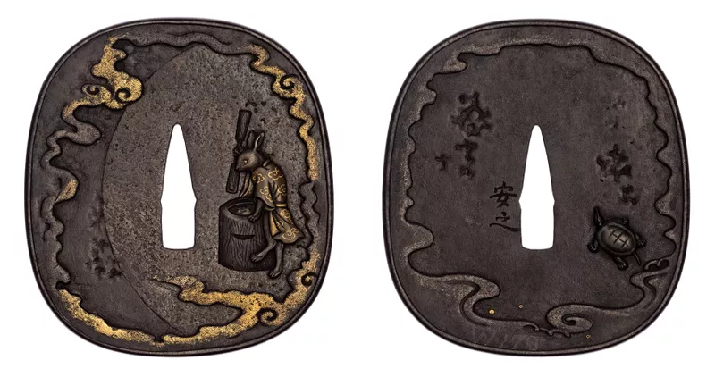 Tsuba, obverse; hare in the moon, pounding rice; reverse: a tortoise near a river, sparkles of moonlight on the water