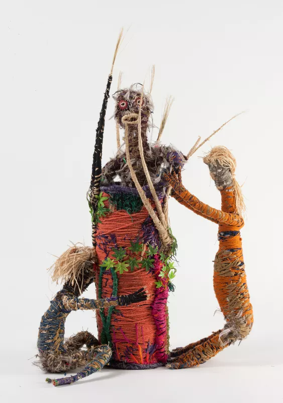 Tjanpi, chicken wire, acrylic wool, raffia, paper raffia, pillow stuffing, wipia and plastic leaves