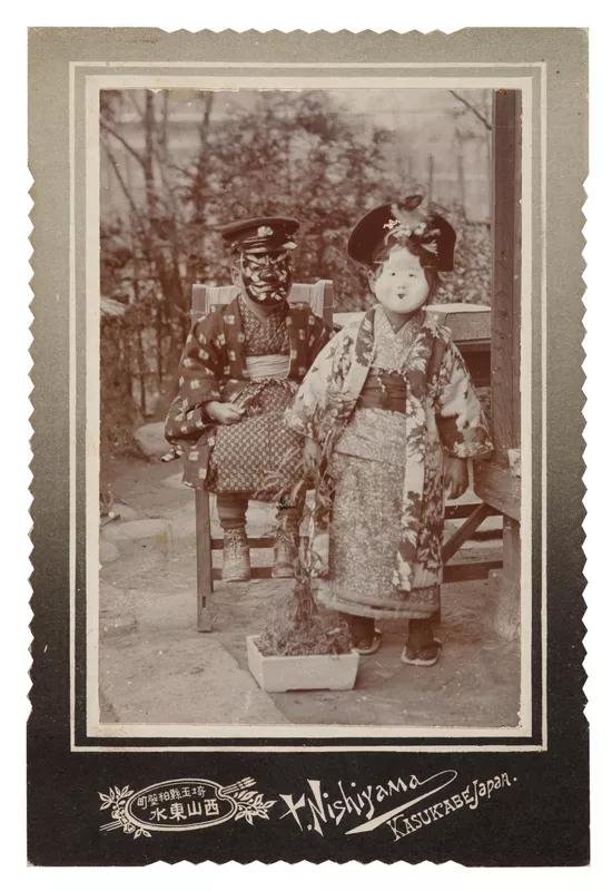 Two children in traditional masks, Tengu and Ohuku