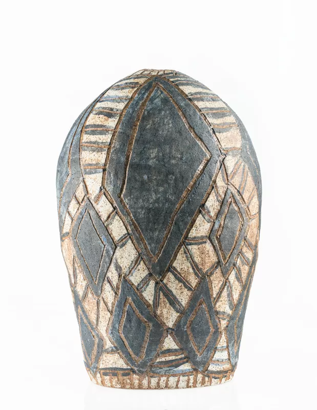 visit. In this sculptural work he recalls the place and merges it with his knowledge and custodial responsibilities towards it. Working with the texture of the stoneware, Carroll incised the surface with diamond block patterns, before filling these segments with a deep-blue hue. Walungurru is Carroll’s dynamic interpretation of the sand dune landscape and country where Wanampi (Rainbow Serpent) once chased a troublemaker across the terrain, creating a track in the earth and bringing water to the dry claypans.