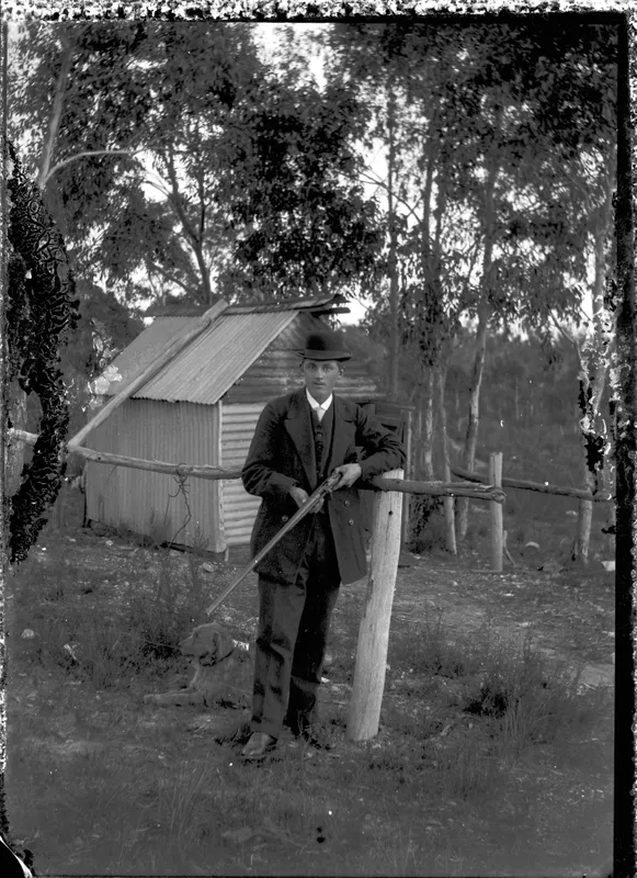 Young man with rifle, iron shed at rear