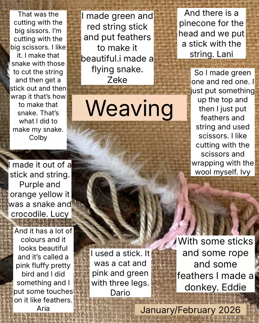 As they weave, the children share stories, exchange ideas and collaborate with one another, strengthening their sense of wellbeing and belonging while building confidence as learners who experiment with materials, problem-solve and refine their techniques. Through rich conversations and creative expression, they continue to develop their communication skills in meaningful and authentic ways.