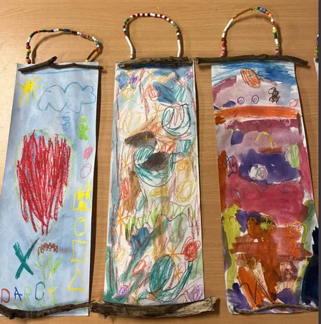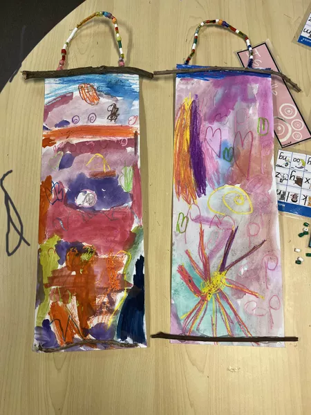 The paintings were finished with wooden sticks and beaded handle, which the children made, helping to practice their threading skills. Art helpers had previously learnt how to make the wool tassels and the Reception children had a choice of tassels they could use to embellish their work.