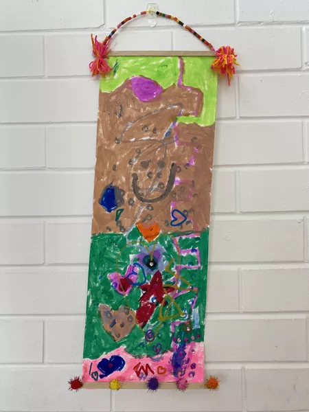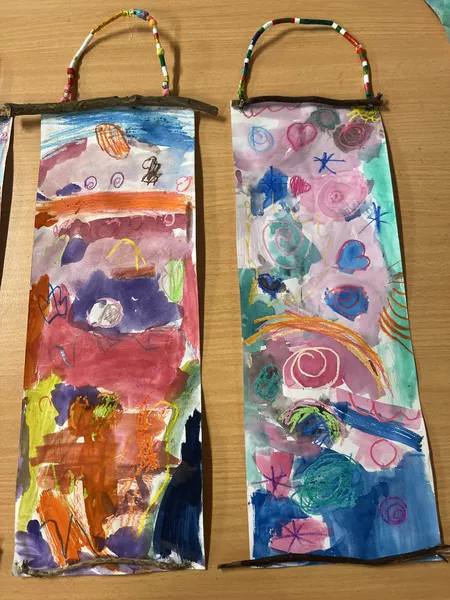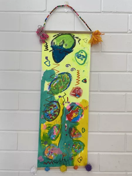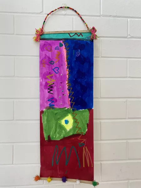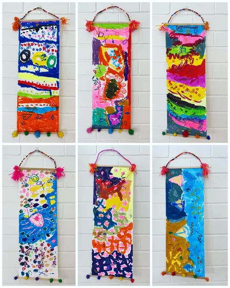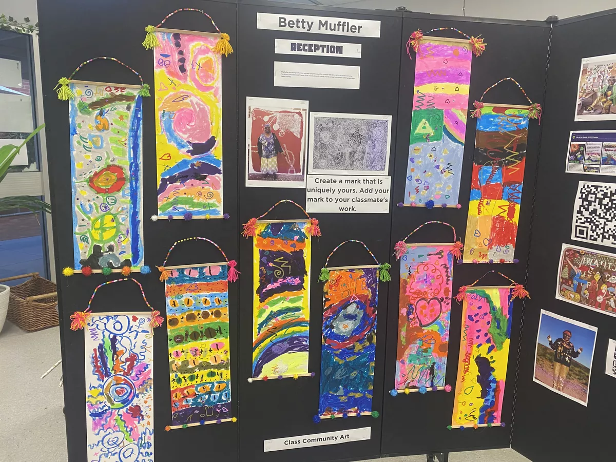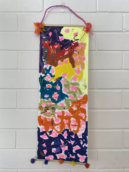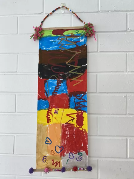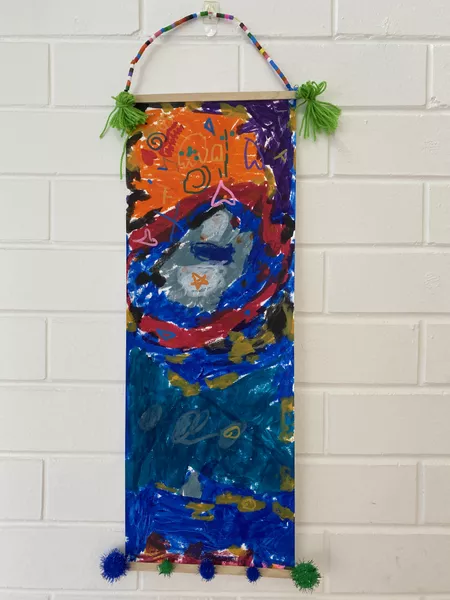 The children created an individual wall hanging using paint slicks and cartridge paper in which they made marks that represented themselves and their environment. Students then chose a symbol and colour which they could then repeat onto each other's painted surfaces, making the pieces collaborative in nature, with each mark symbolic of the uniqueness in our school community.