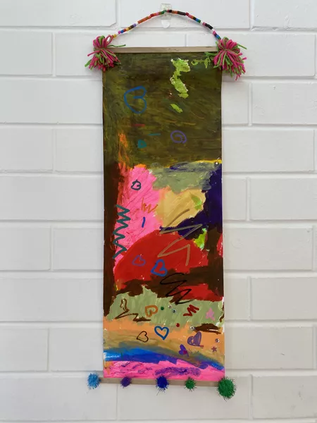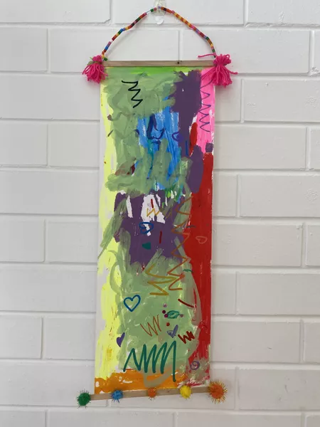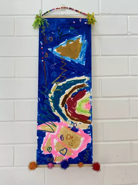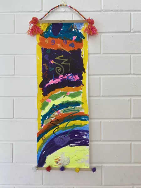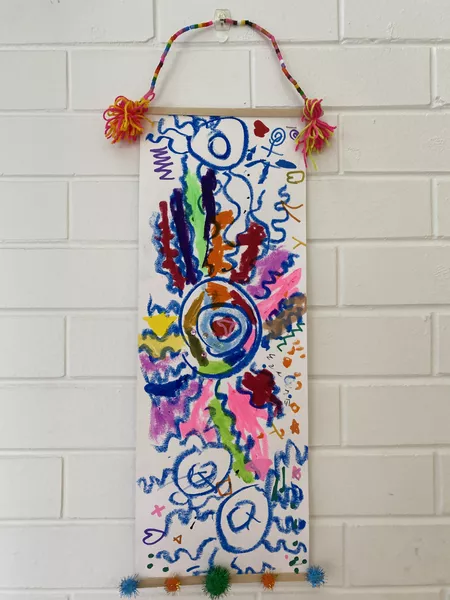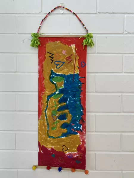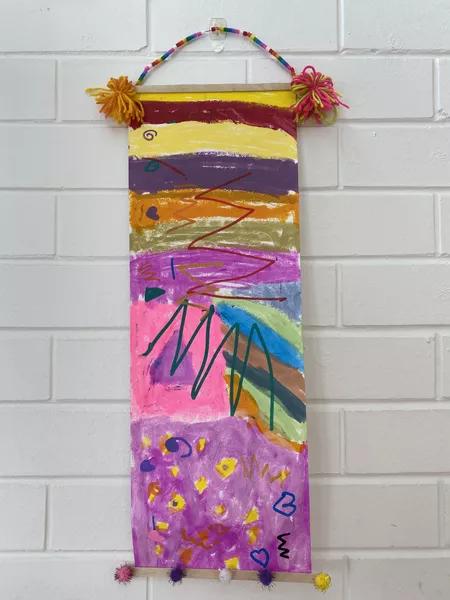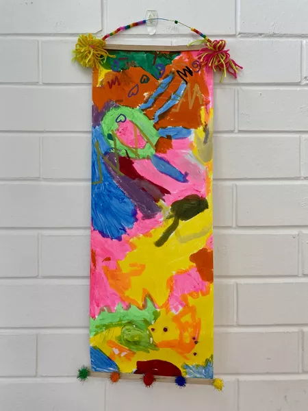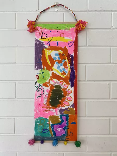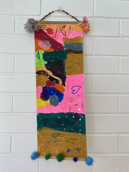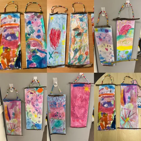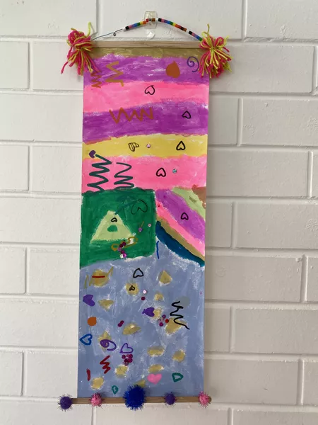 The children created an individual wall hanging using paint slicks and cartridge paper in which they made marks that represented themselves and their environment. Students then chose a symbol and colour which they could then repeat onto each other's painted surfaces, making the pieces collaborative in nature, with each mark symbolic of the uniqueness in our school community.