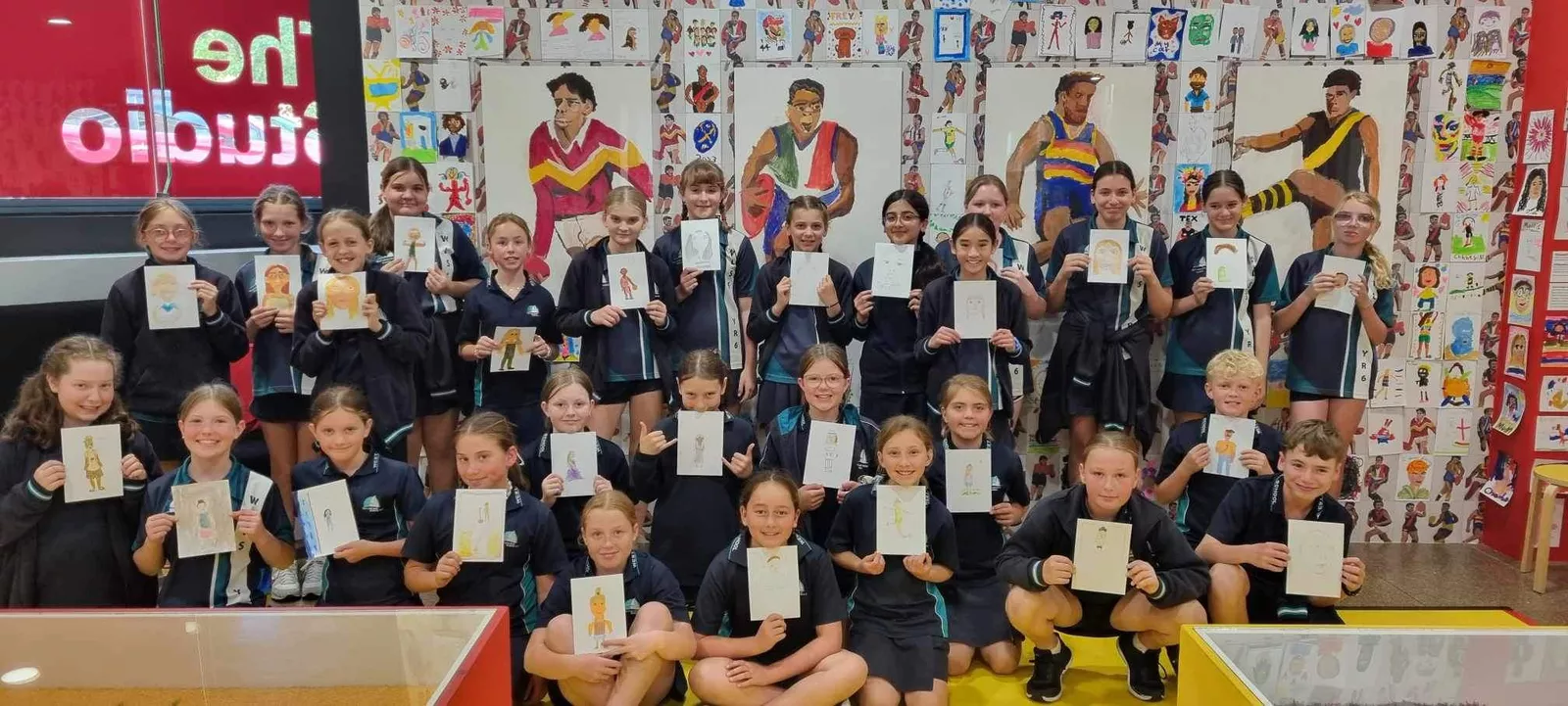West Lakes Shore School are regular visitors to AGSA and take advantage of these options for their students. On a recent visit Year 5 and 6 students had a self-guided visit of Tarnanthi and the permanent collection with their art teacher, Lisa Zappia, took part in the free Studio activity and had a Drawing in the Gallery workshop with artist facilitator Lauren Herraman.