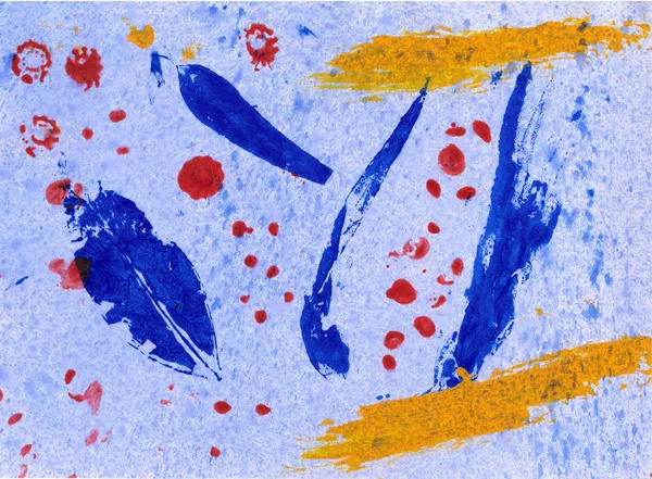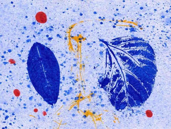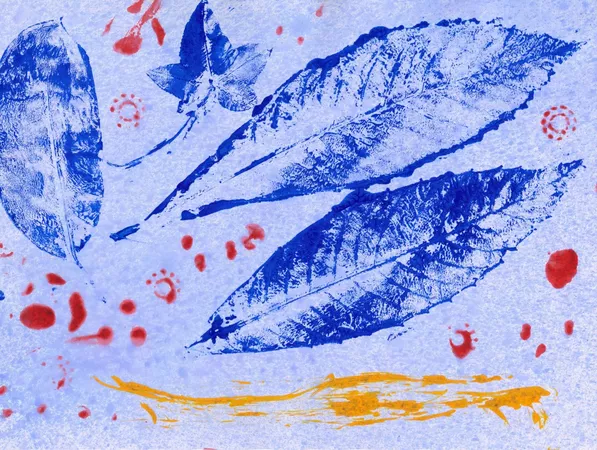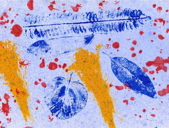 With their families, students explored their local environments to collect leaves and natural items to use as bush brushes and nature stamps. Students collectively decided that they wanted to use similar colours to those used by Judy Watson in her original piece. They began by rolling blue paint on both sides of their leaves to create leaf monoprints. Once dried, students then added paint strokes using bush brushes dipped in yellow paint and they used natural objects such as pinecones, seedpods and gumnuts as stamping (relief printing) tools using red paint.