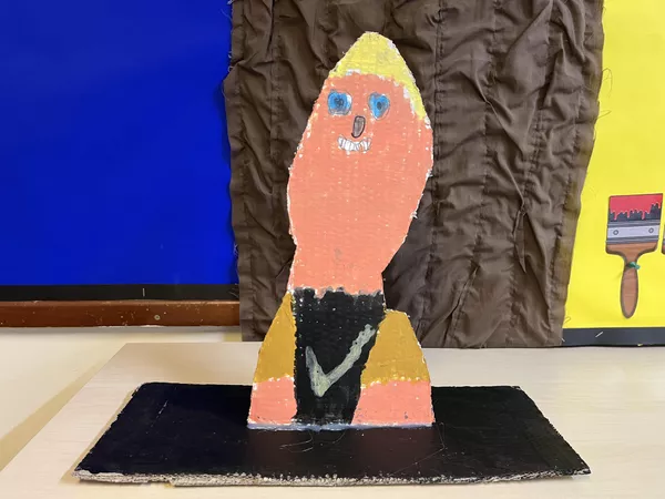 Back in the classroom, and beyond 2023, their teacher has continued to weave Vincent Namatjira into the classroom. The year 2-4 students looked at portraiture with the theme of power. They examined the work Australia in Colour, a series of 21 portraits depicting significant people including politicians, historical figures, athletes and musicians from Australia and overseas. In groups they discussed the idea of power and debated which figures they classified as a 'villain' or 'hero' - and why. The students then spent the term practising their drawing and painting skills, working towards creating their own three dimensional double-sided self portrait, akin to Namatjira's Close Contact.