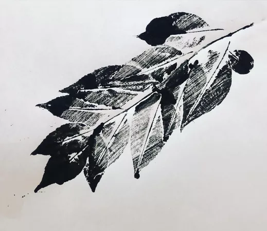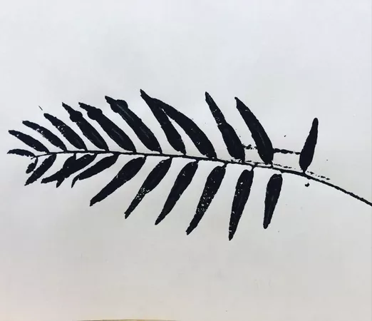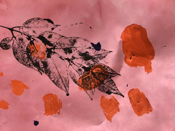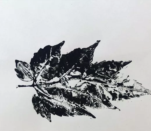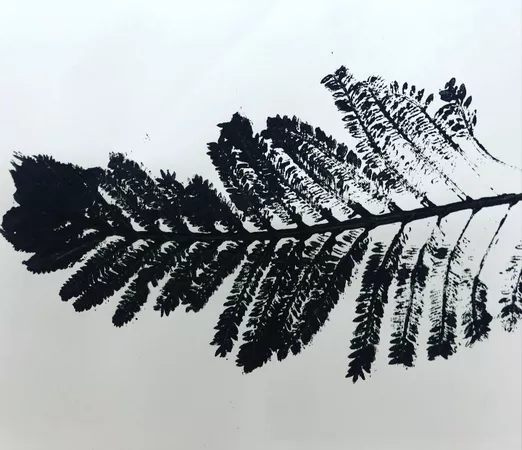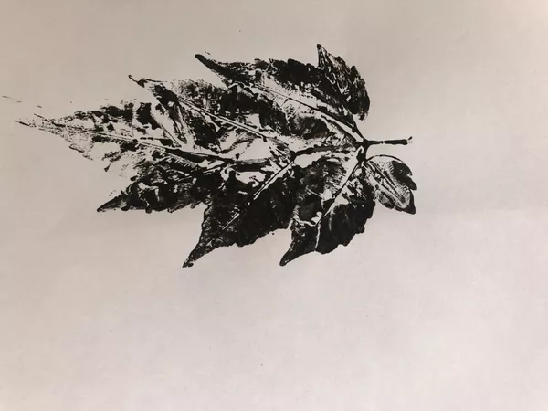 Students collected plant leaves from their school environment to use for the final layer of their work of art. They rolled black acrylic paint on both sides of their chosen leaf and placed it on their coloured background. Students then pressed a clean white piece of paper over the top which transferred the leaf print onto the final layer of the coloured paper (above) and a monoprint on white paper (below).