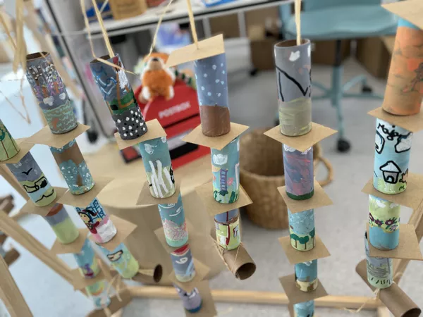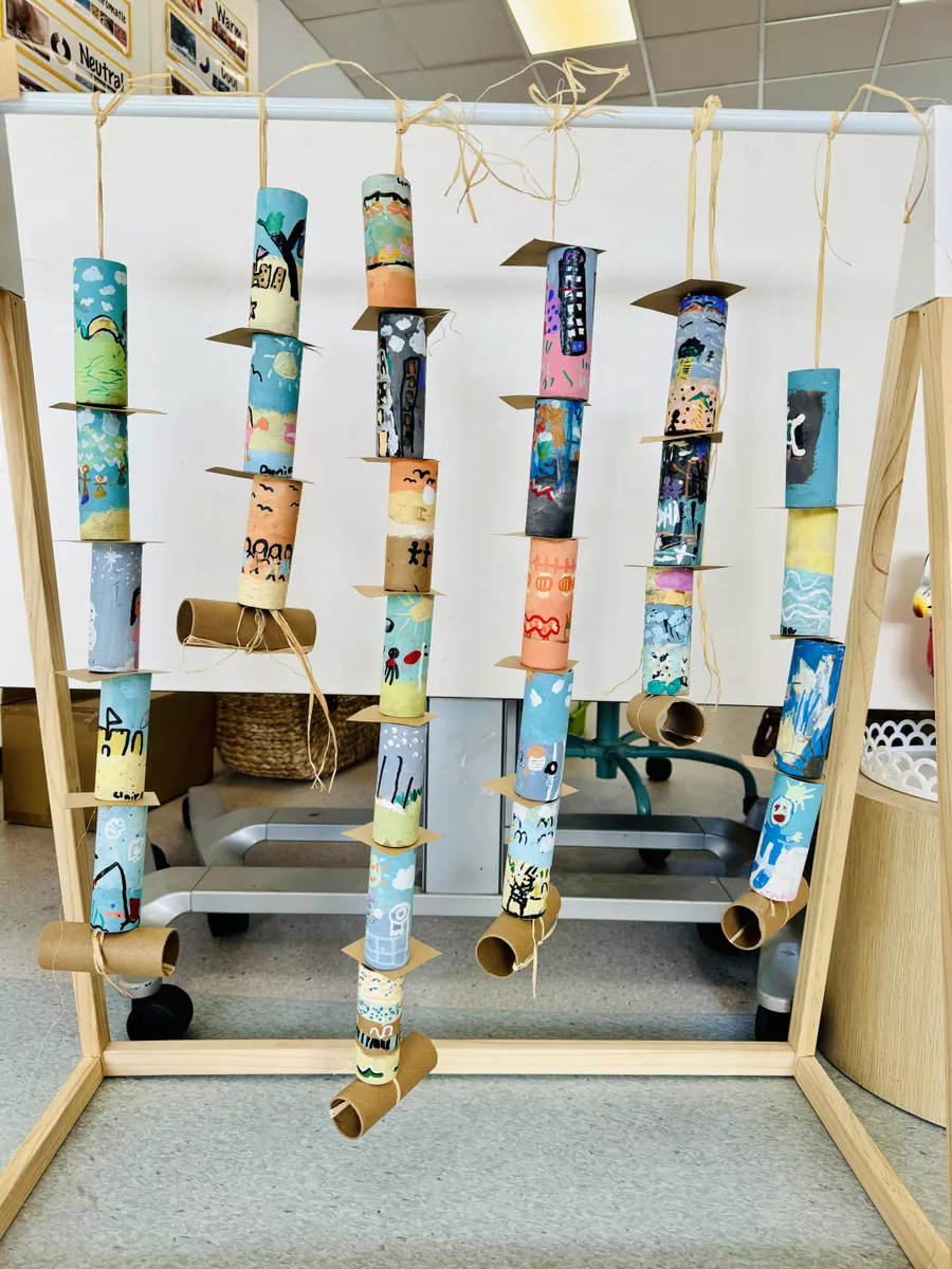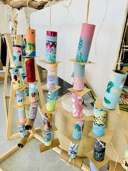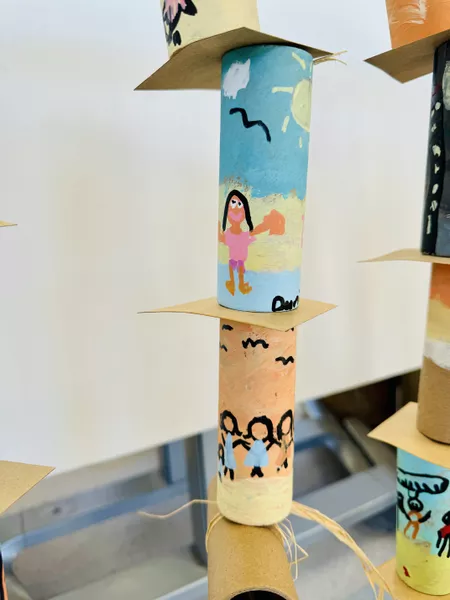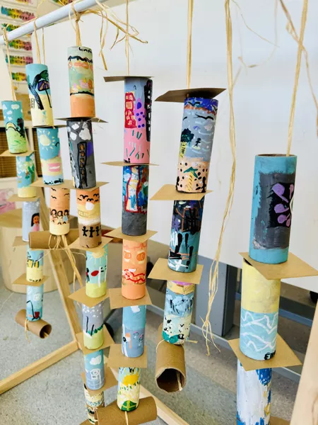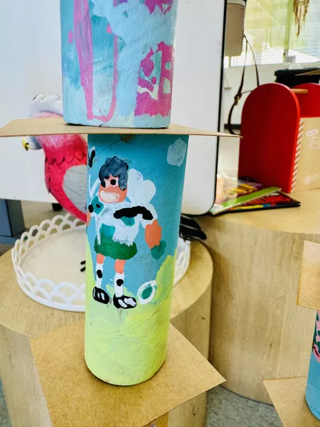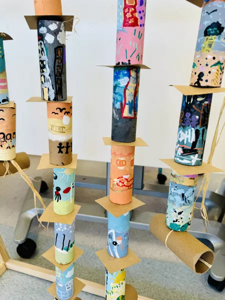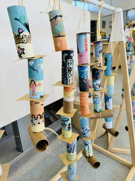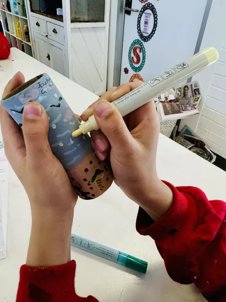 The year 2 students watched a video of Inkamala talking about her life and the stories she paints on her ceramic vessels. After looking at examples of her work the students then painted their own story onto cardboard rolls. Some children painted an event, celebration, life story, hobby, experience - essentially something that stood out in their lives. We first painted the background two colours with acrylic paint and then used paint markers to draw over the top. We hung our works of art together in class groups as a collection of our stories. They make a great talking point and discussion among visitors to our classroom.
