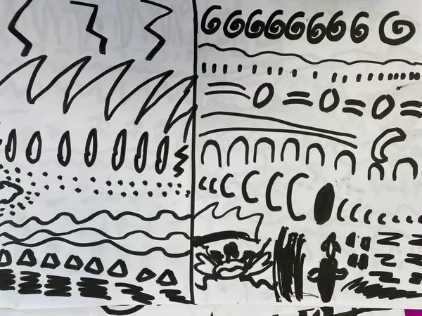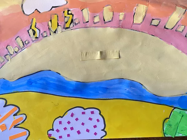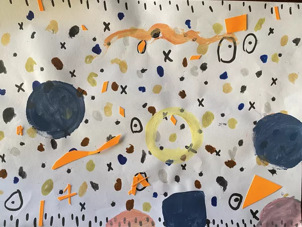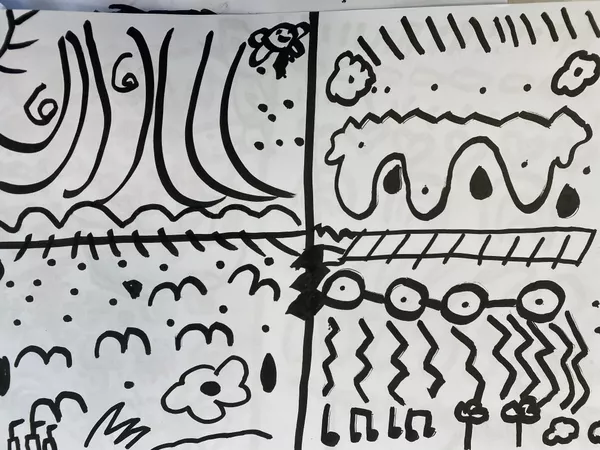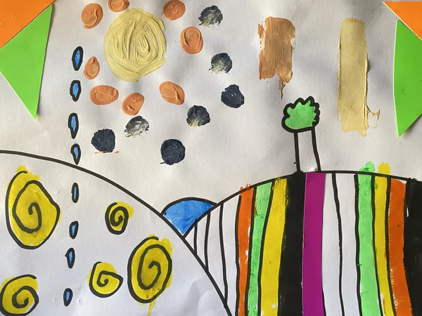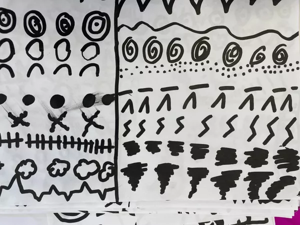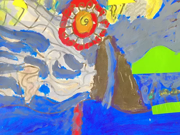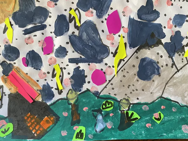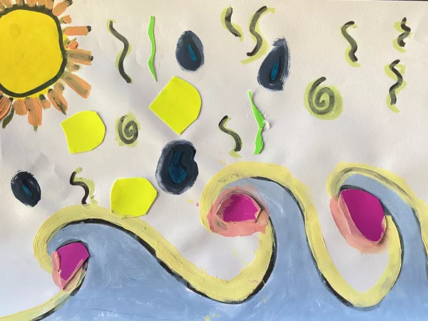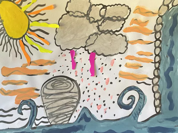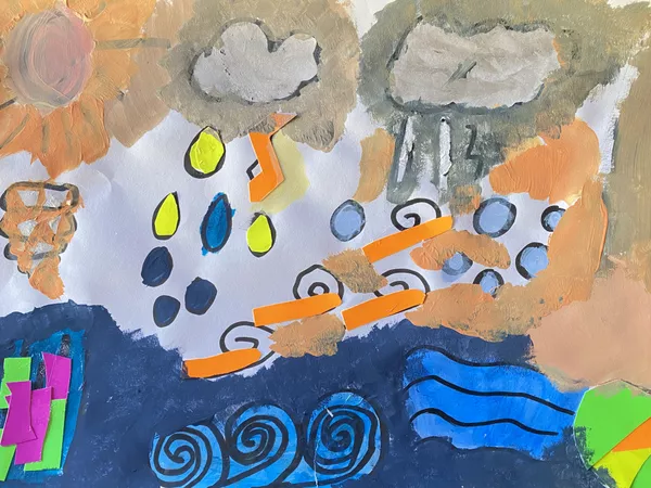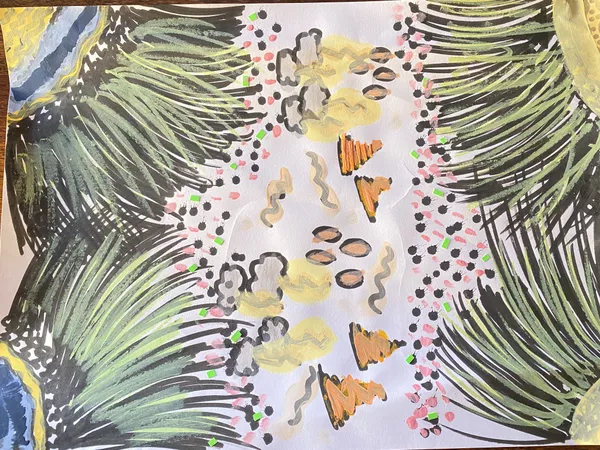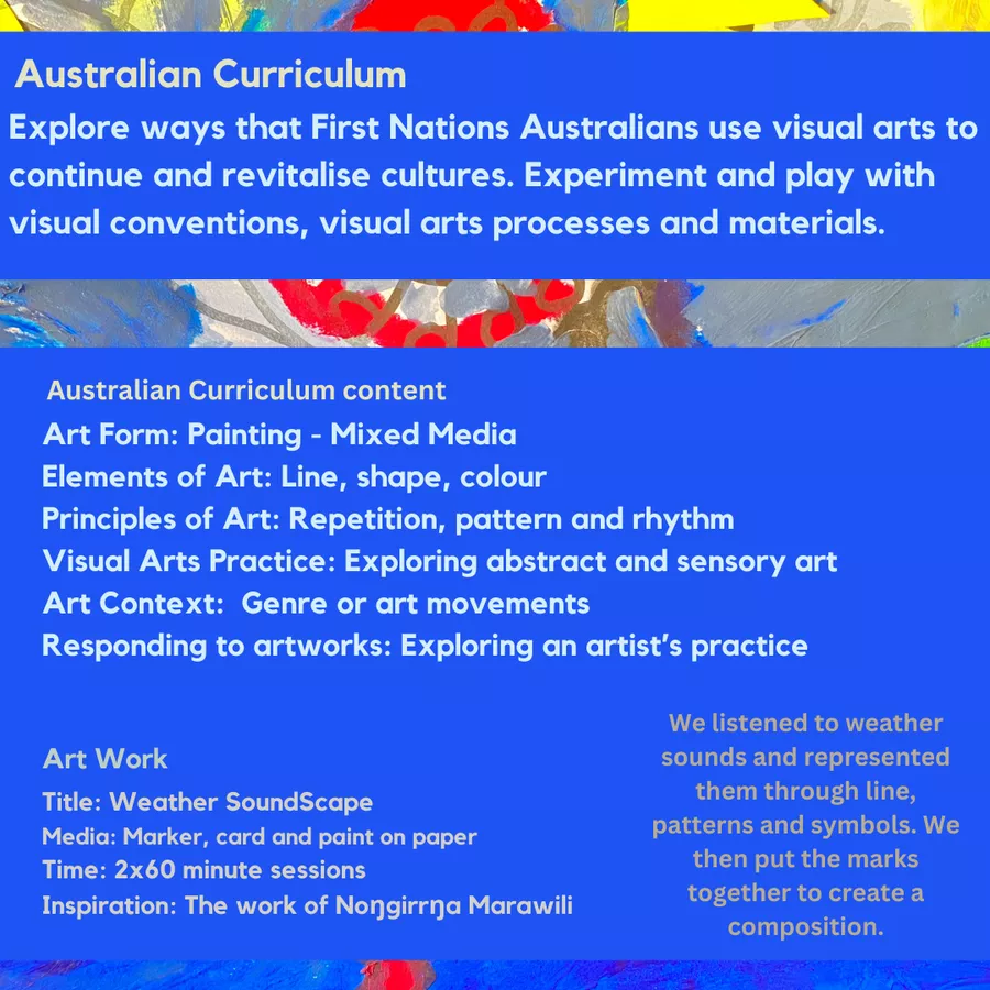 Children were introduced to Marawili by watching a short artist video available in the AGSA Resource. This allowed students to hear directly from the artist and see Marawili painting. Students then listened to weather sounds (from YouTube) and represented these sounds on paper using lines, patterns and symbols. Using those marks, students created a soundscape composition to the theme of weather. The initial layers consisted of black marker line, followed by fluorescent paper and card to enhance some of the shapes and lines. Finally the children used acrylic paint to represent the colours they associated with the weather and their environment.