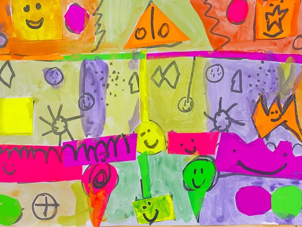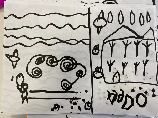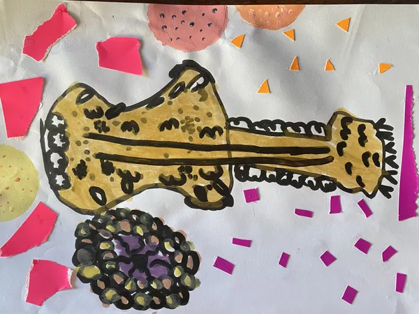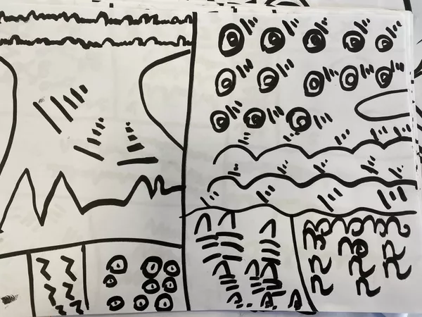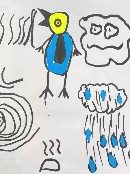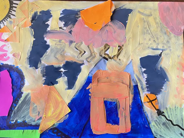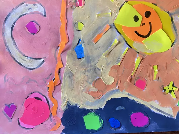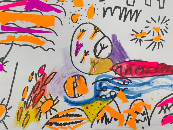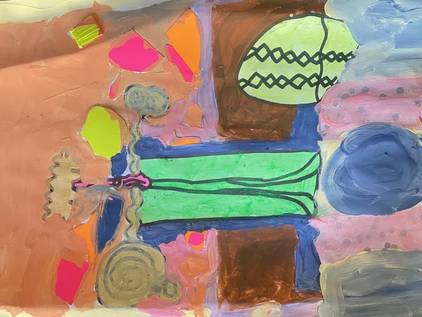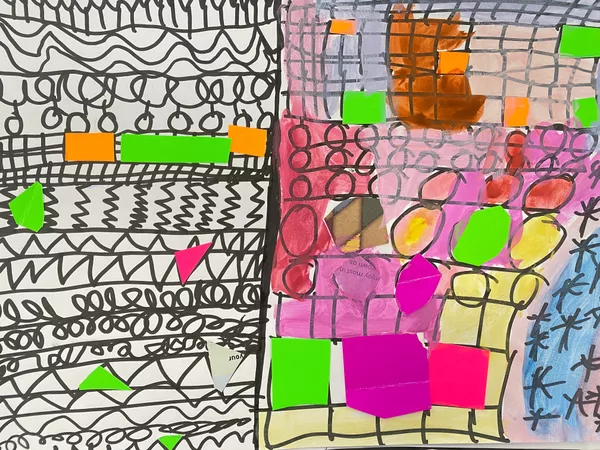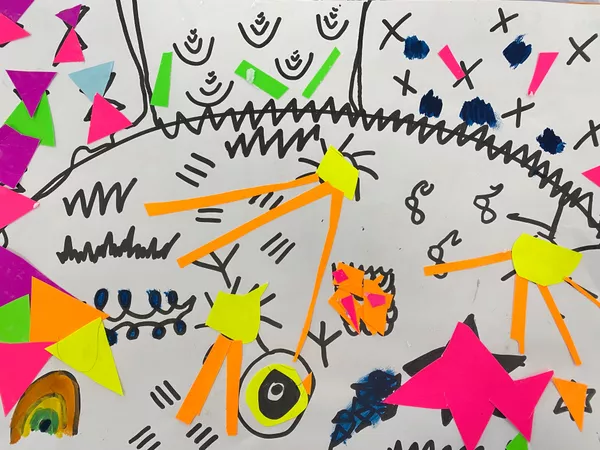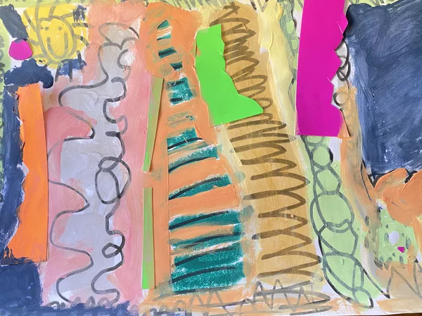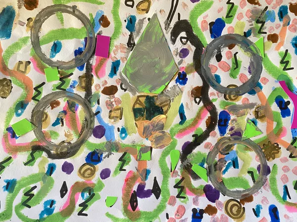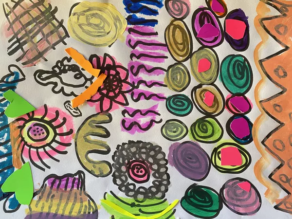 Children were introduced to Marawili by watching a short artist video available in the AGSA Resource. This allowed students to hear directly from the artist and see Marawili painting. Students then listened to weather sounds (from YouTube) and represented these sounds on paper using lines, patterns and symbols. Using those marks, students created a soundscape composition to the theme of weather. The initial layers consisted of black marker line, followed by fluorescent paper and card to enhance some of the shapes and lines. Finally the children used acrylic paint to represent the colours they associated with the weather and their environment.
