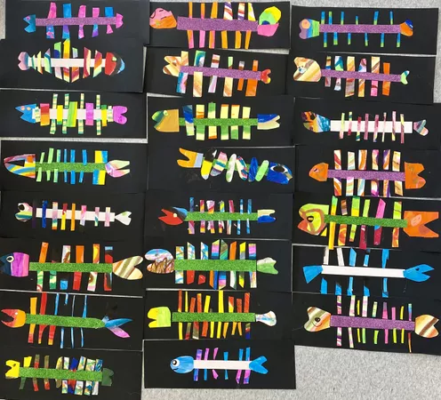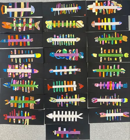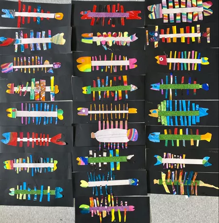 Year 3 students created fish rarrk (cross-hatching) collages inspired by Sally Morgan's book 'The River'. We began by listening to The River on Story Box, narrated by Ydinji performer and comedian Steph Tisdell and then watched River Kids where we learnt more about the Murray River. This allowed us to connect Morgan's work to the world of my students as they were familiar with this waterway in South Australia. We talked about the impact of European settlement and compared what life was like then to now.