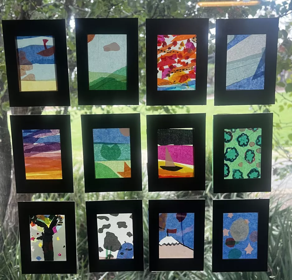 ‘In class, students discussed ideas about traditional and contemporary art methods and the messages portrayed in these works. We also discussed the stories passed down from the elders, the connections to land and their environment and the symbols used. Students were then asked to think about a special place or moment and communicated this by creating collages using tissue paper on acetate sheets. Students looked at how layering the tissue paper created new colours particularly when placed against the windows throughout the art making process. The students’ works of art will be displayed on their classroom windows for Reconciliation Week'