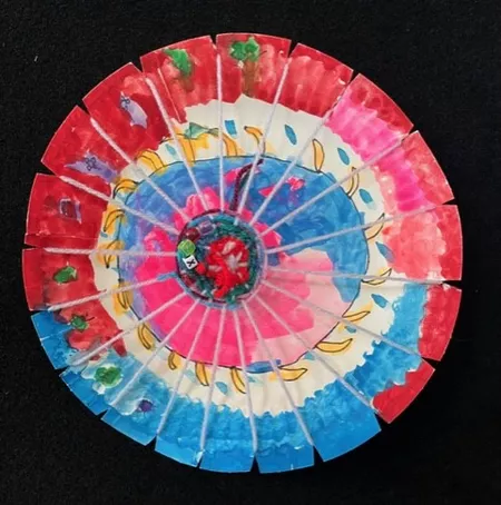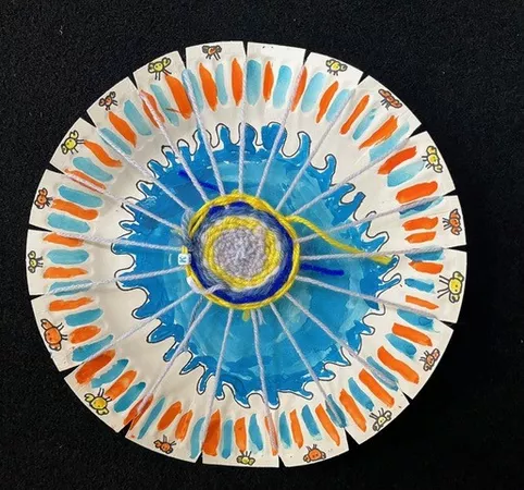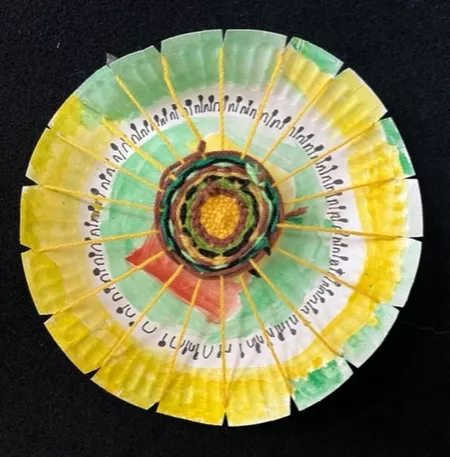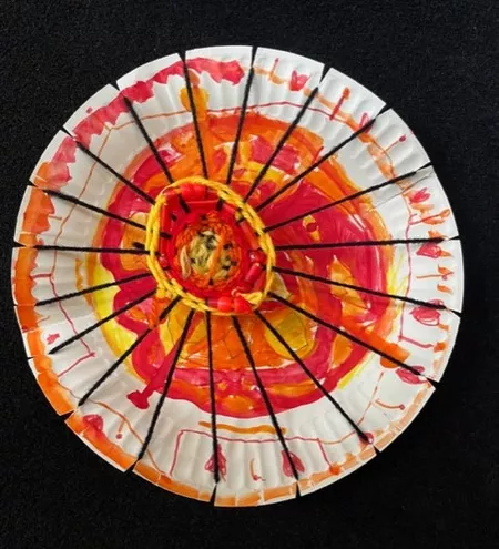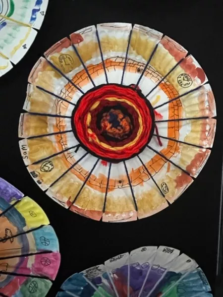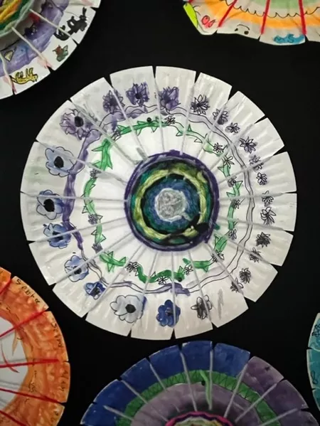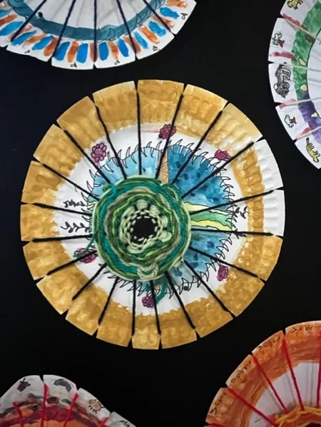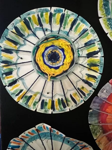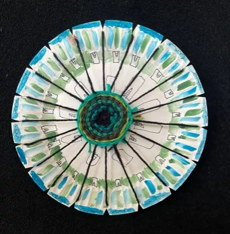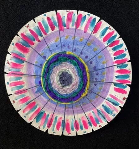 In response to Koolmatrie's work, students drew a picture of a special place that they had their own connection to and painted a background on their paper plate loom using the imagery and colours from their plan. The wool colours that they chose to weave on top also reflected this special place both physically as well as representing the feelings that students experience when thinking about their special place. - Jessica Hancock, Visual Arts Teacher