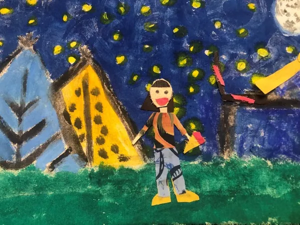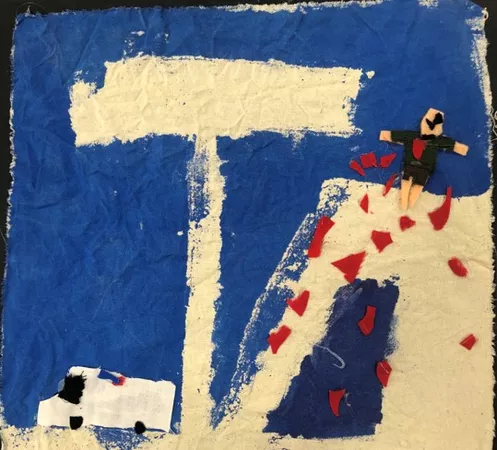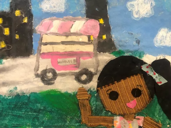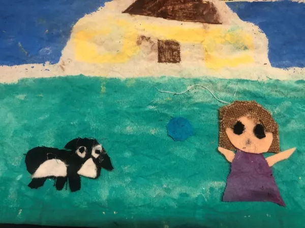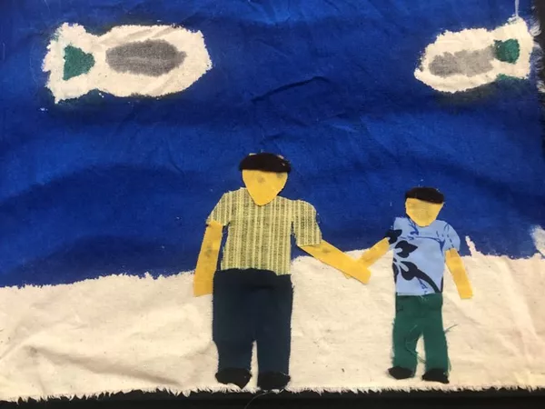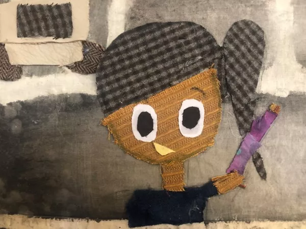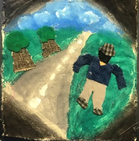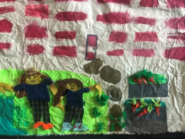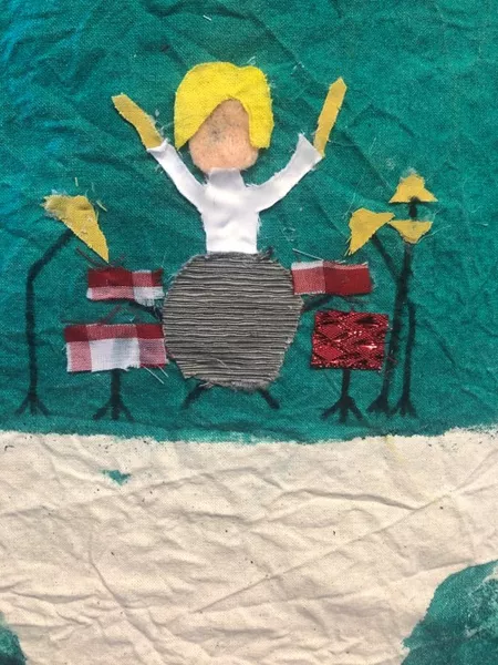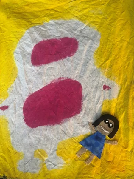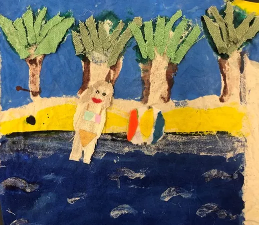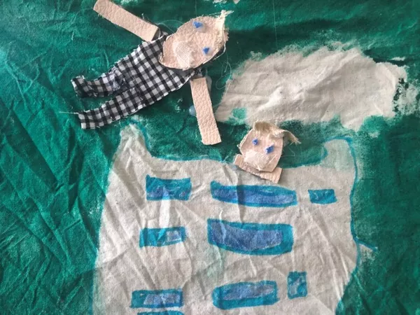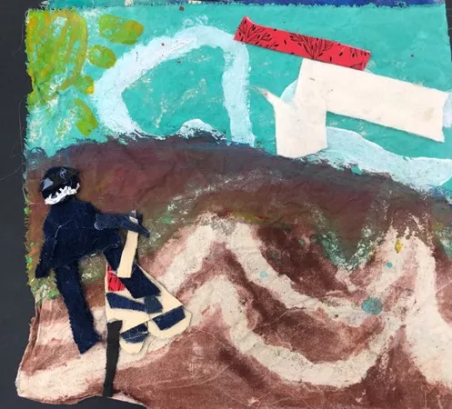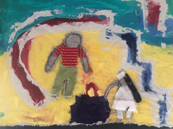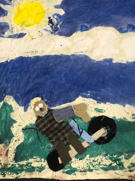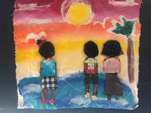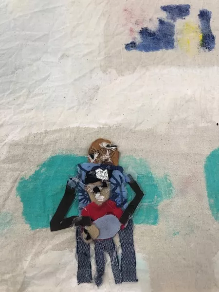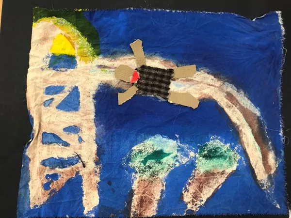 Considering these themes explored by Mukeba, the students created mixed media collages which depicted their own early childhood memory. The students first practiced continuous line drawing, using their dominant and non-dominant hands, creating portraits of their friends. They then designed a simple drawing of their memory, learning art terms such as background, foreground and focal point. Students painted their calico background and then used different coloured and textured fabrics to recreate their memory in a collage. - Art Teacher Michelle Bawden