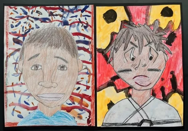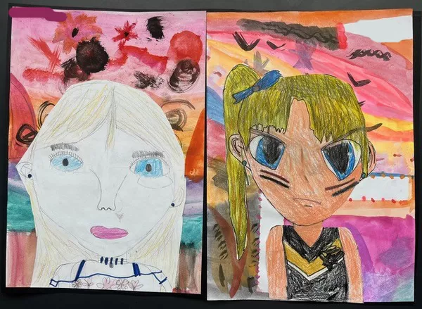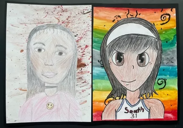 The students responded to music, experimenting with different techniques and materials while thinking about how colour, line, shape and pattern can portray mood. Following this, students selected media to create a relaxed background and drew a realistic self portrait focussing on proportion and facial details. Students then thought about a moment that they felt brave and powerful and drew a second self-portrait. Students chose materials and techniques and represented this feeling in any way that inspired them. Some of the ways students included silhouettes, manga, animals and characters from popular culture. - Jessica Hancock, Visual Arts Teacher