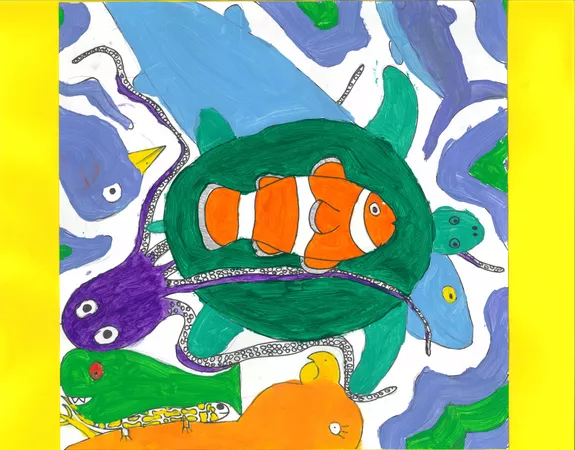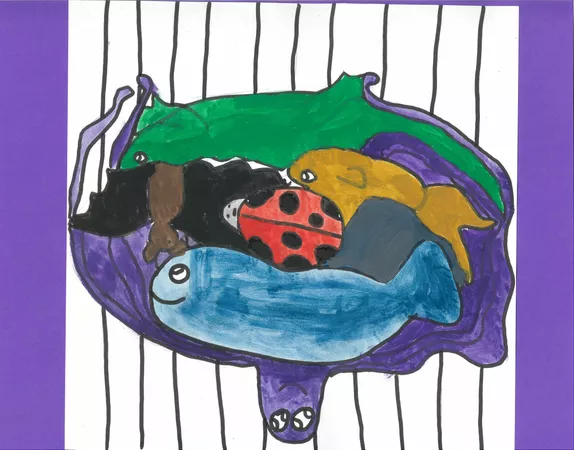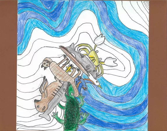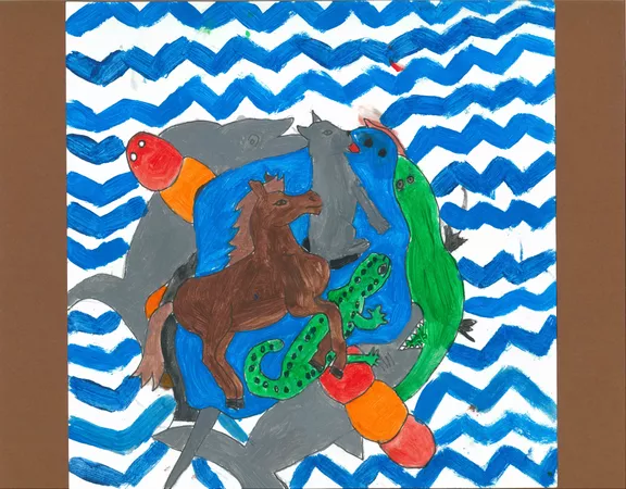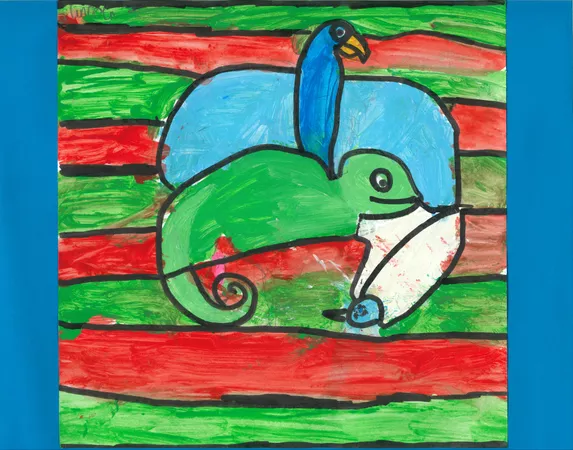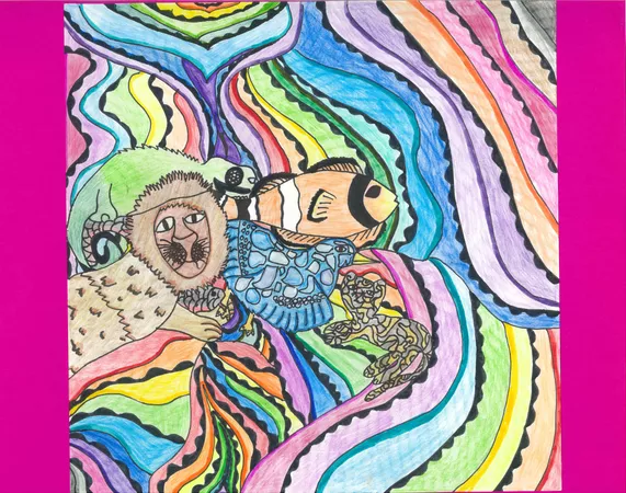 Year 5 and 6 students from Balaklava Campus Horizon Christian School learnt about the life and work of John Prince Siddon. This included watching the AGSA video about the artist, and discussing his works of art with a focus on his piece Fear. Students then drew a creature before adding others, fitting them into the negative shapes. Sharing and discussing jigsaws helped students who grappled with this concept, we also studied tessellations of MC Escher. Students chose to use paint or coloured pencils and texta to complete their works of art. Focusing on shape, pattern and colour, and again influenced by the work of Siddon, students embellished the negative space of their pieces with these art elements.