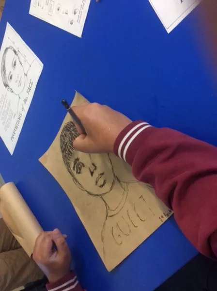 A trained facilitator guided students through a series of drawings exploring facial features, mark making, proportion and tone before beginning a final portrait.