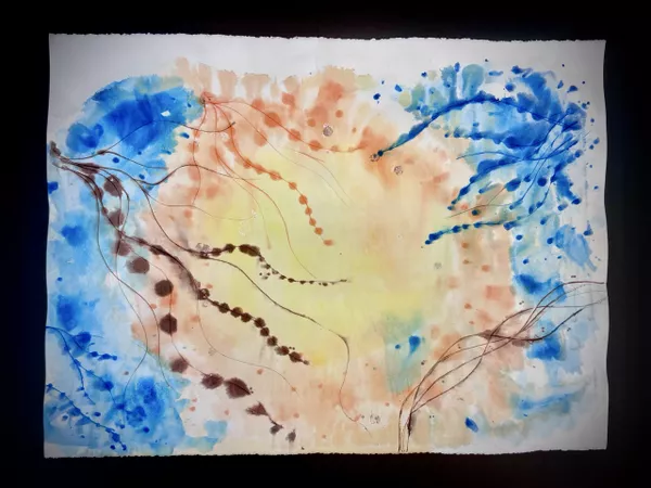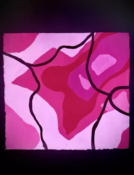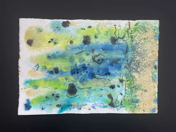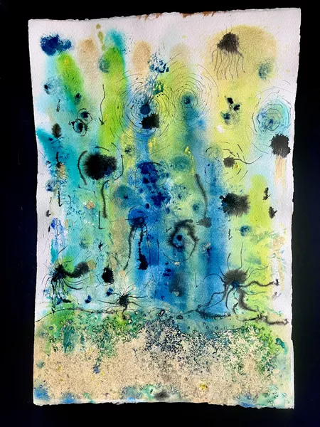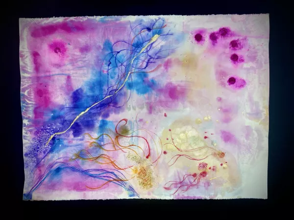 Documenting sites on Country, Marawili captures the atmospheric effects of wind, water and lightning using residual magenta ink from cast-off printer cartridges mixed with natural pigments.