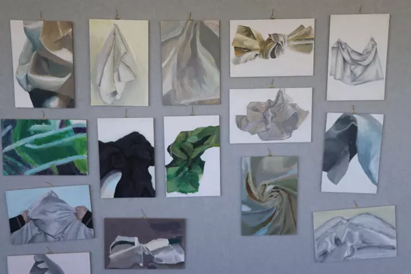 Year 11 students have been undertaking a series of explorations with drawing, painting and ceramics. They began by looking at the draped paintings of Scottish artist Alison Watt, considering how she portrays the idea of absence through her large scale paintings of linen and fabric. Using photography students created their own compositions of draped fabric which they then created their own paintings from.