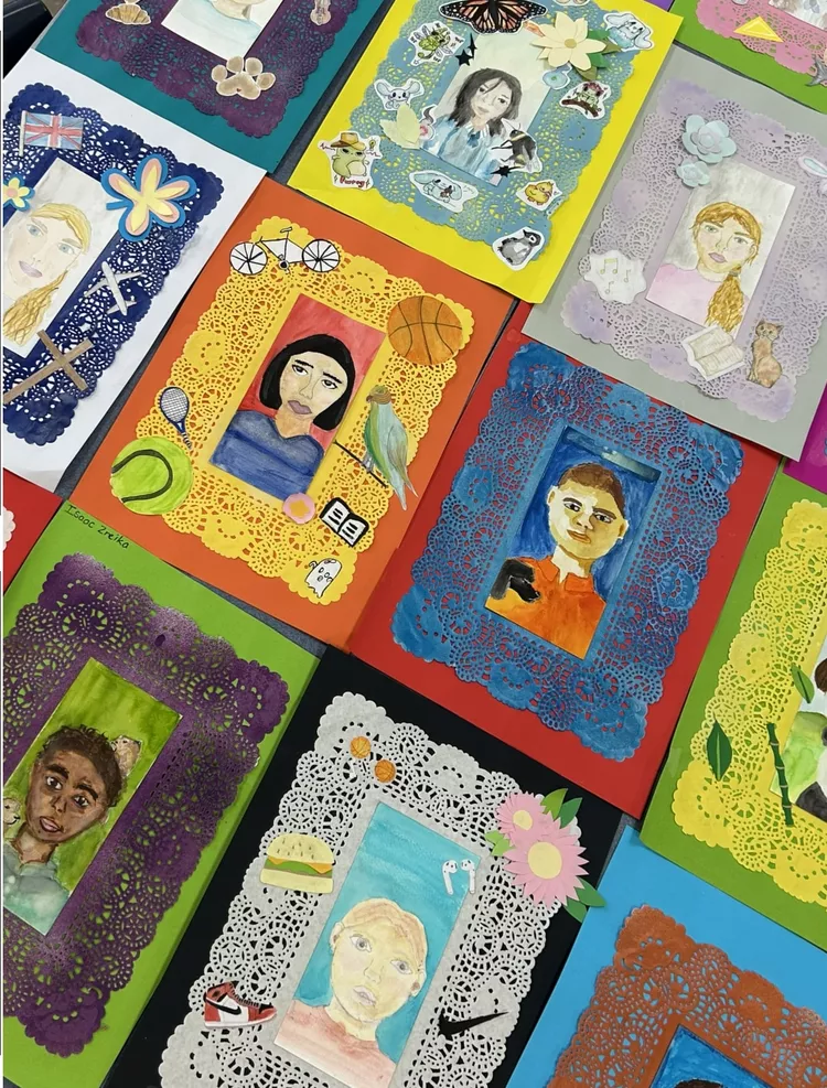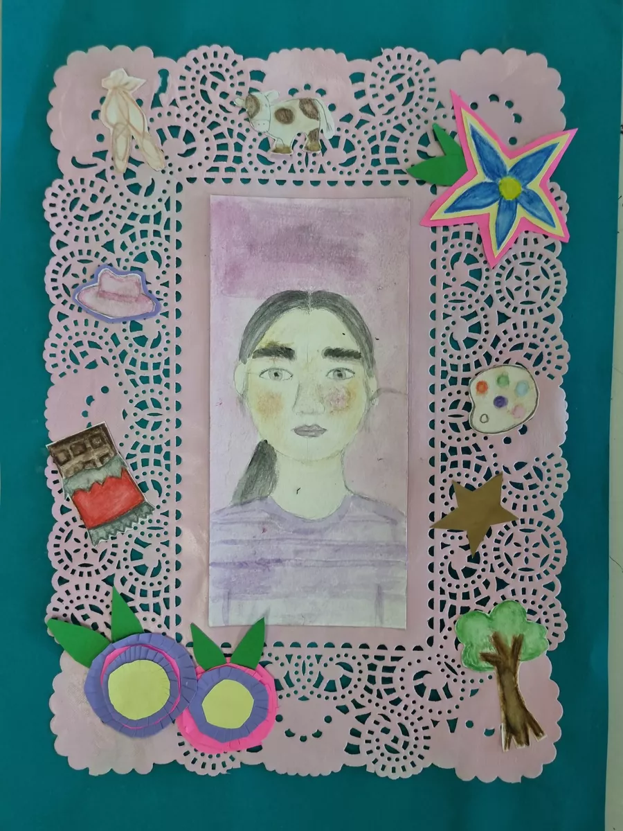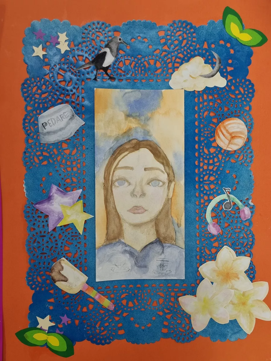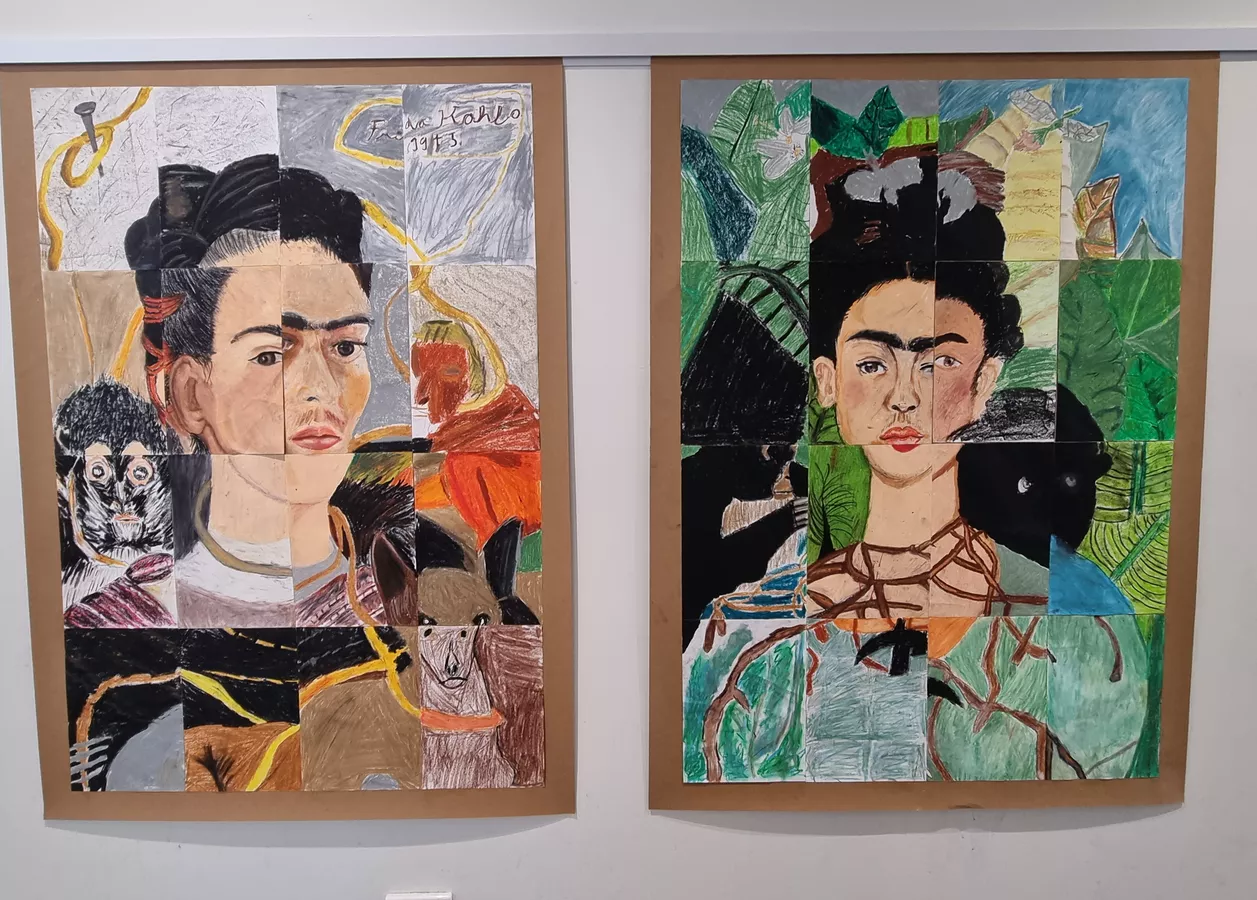 After visiting the Frida and Diego: Love and Revolution at AGSA, Year 9 students developed their own self-portrait using mixed media collage to show their personal interests and individuality. They were inspired by their time in the Studio creating collages in response to Alice Lindstrom and introduced an element of this into the borders of their self-portraits. The idea of visually framing the artwork stemmed from conversations about the presentation of the work within the Frida and Diego exhibition and how the work was curated.