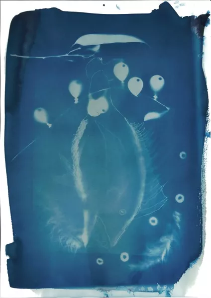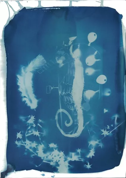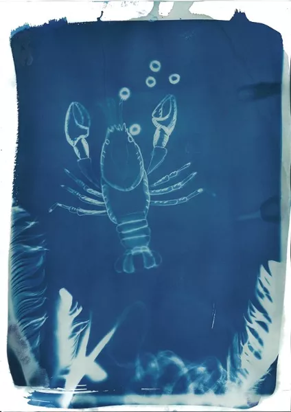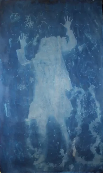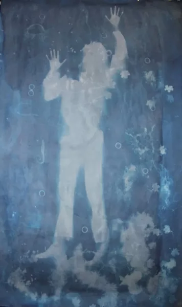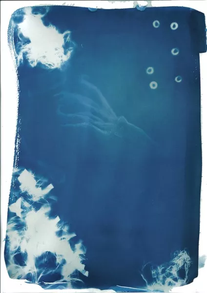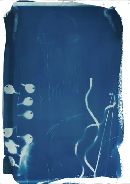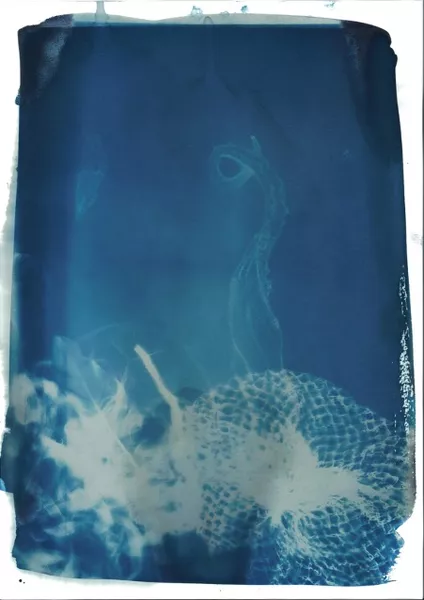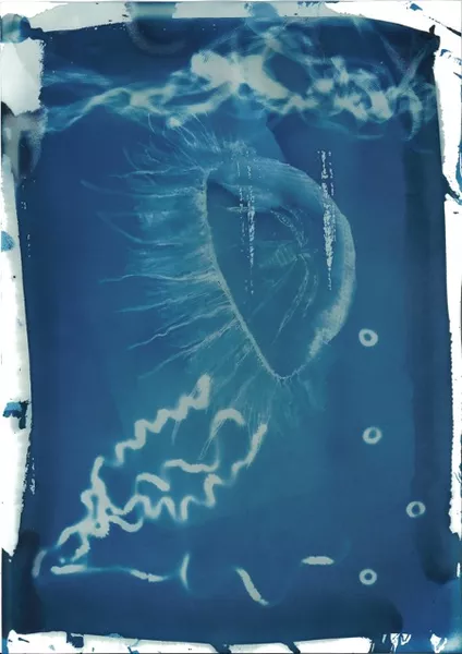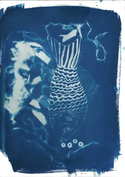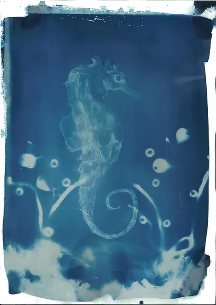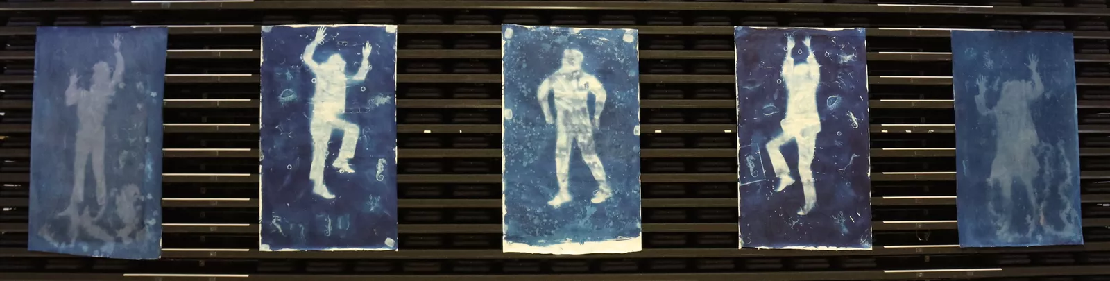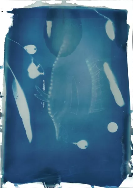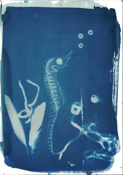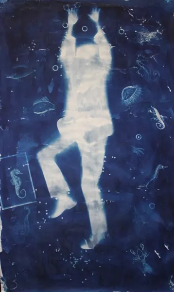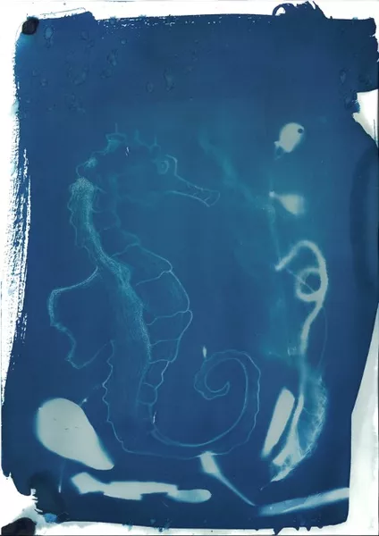 The students' cyanotypes depict drawings of marine life and silhouettes of people floating under the sea, highlighting their relationship with the natural world, akin to the way Sonja and Leecee Carmichael made connection to their own environment.