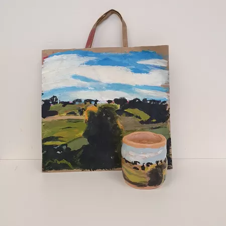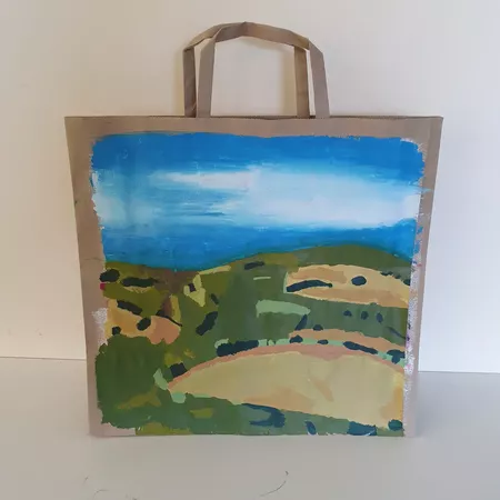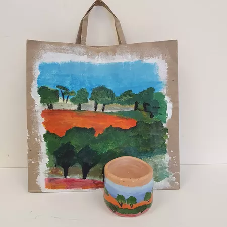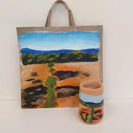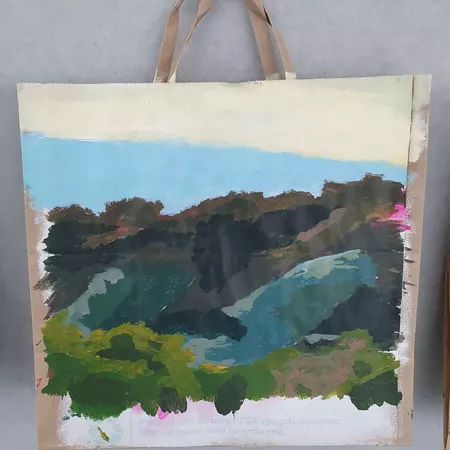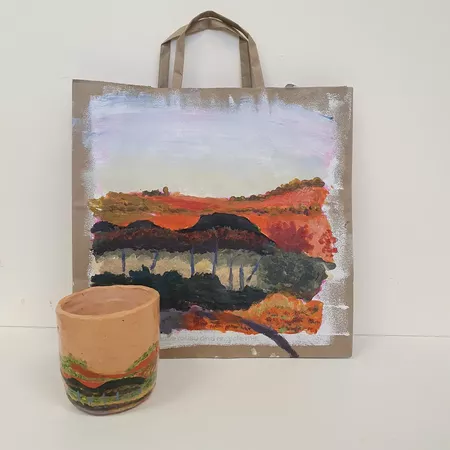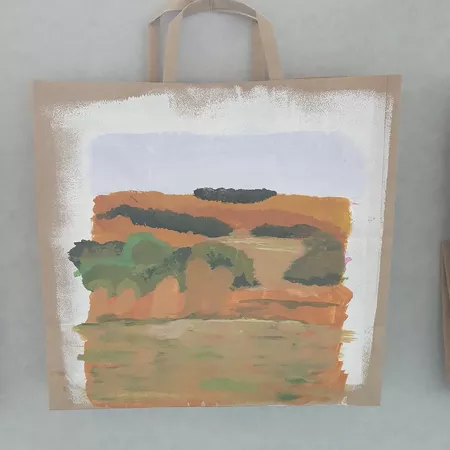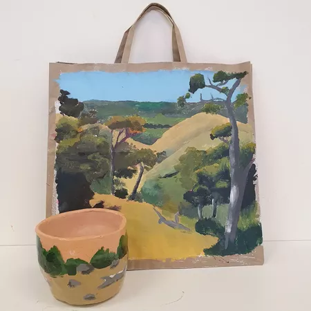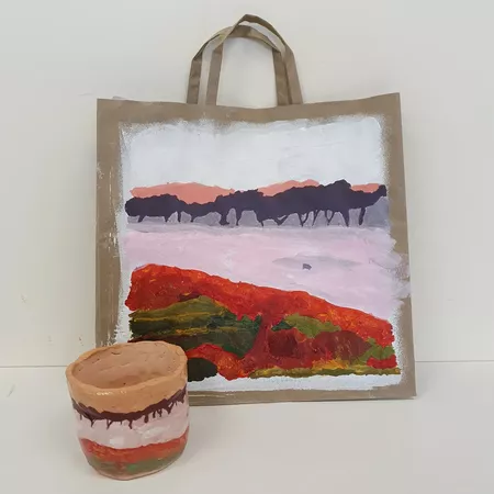 Year 8 students at Tatachilla Lutheran College engaged with the work by Clarice Beckett with the imagery, information, curator talks and videos provided in the online AGSA education resource. The students used imagery of Mclaren Vale and surrounding region as inspiration for a painting that incorporated tonalist techniques used by Beckett. Students worked on recycled bags in response to Beckett’s occasional use of unusual surfaces, as well as translating their paintings onto ceramic vessels. - Art Teachers Jessica Felgenhaur & Harriet Geater-Johnson