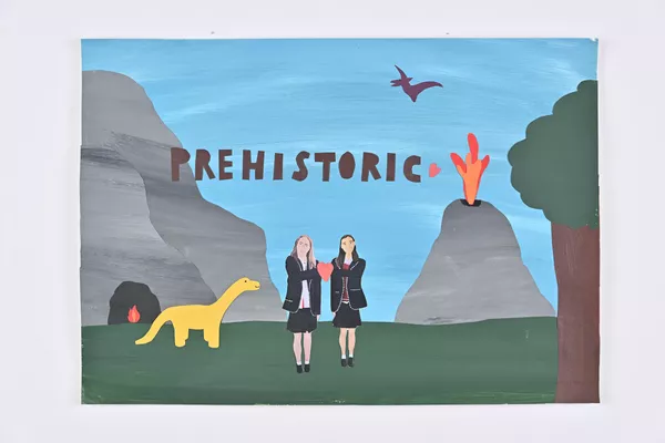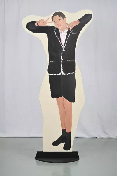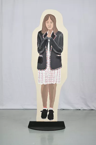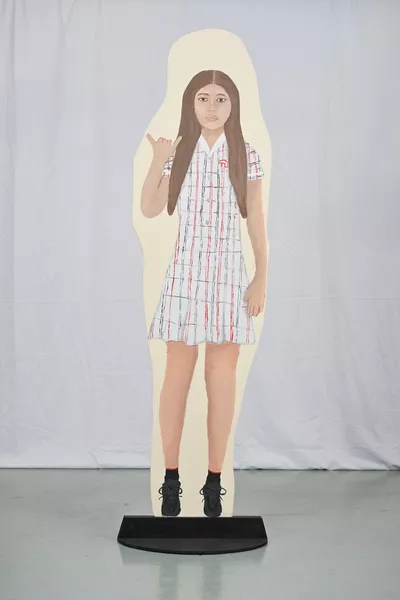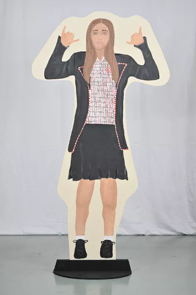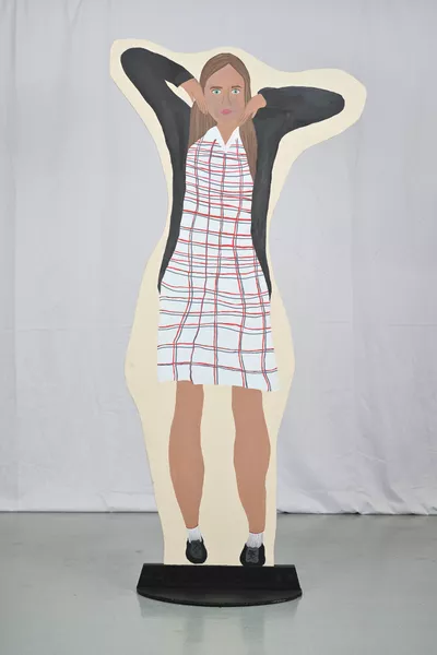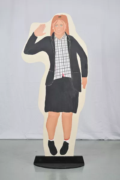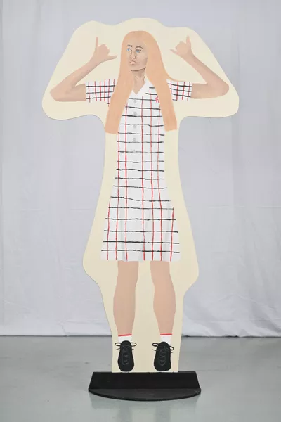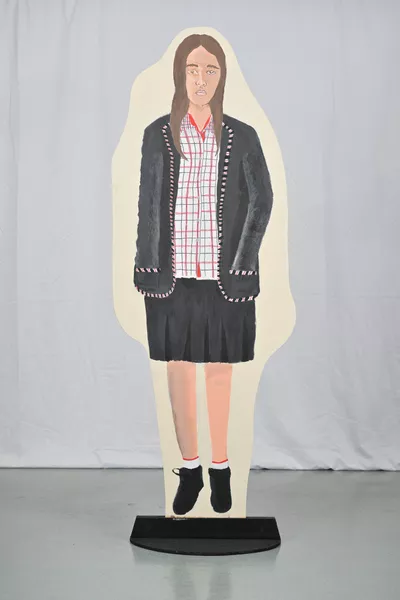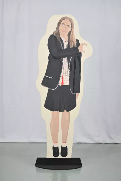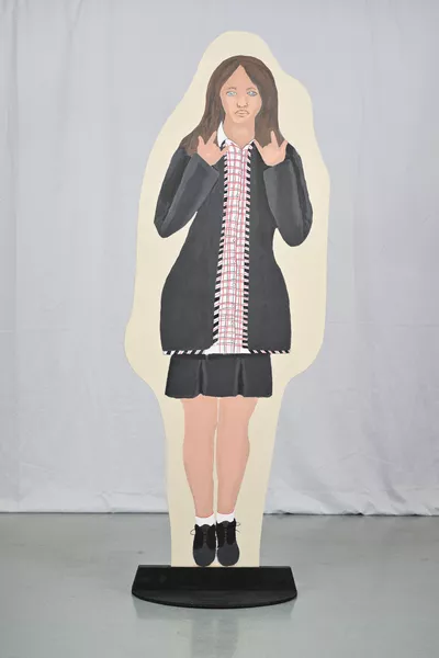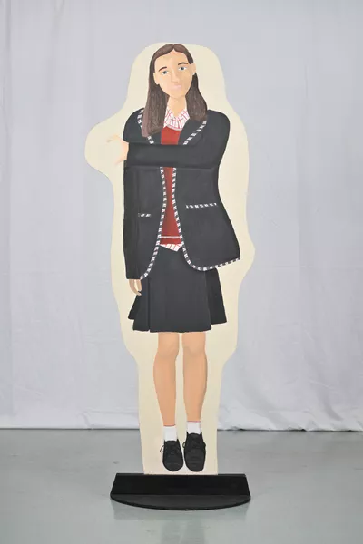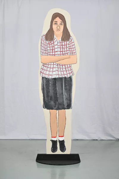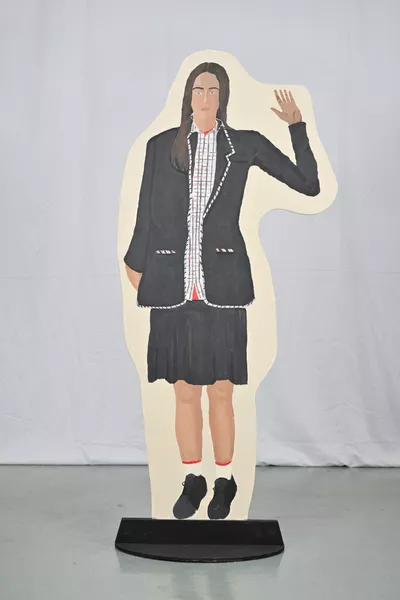 In response to Close contact by Vincent Namatjira, students have used plywood to create self-standing, three-dimensional paintings of themselves striking an irreverent pose in school uniform.