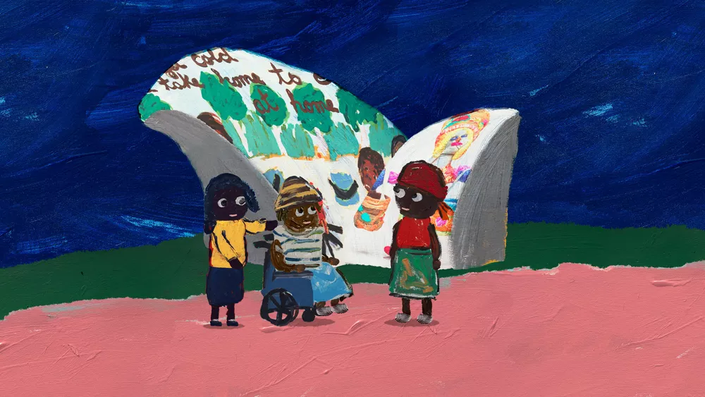The animation Two girls brings figures from Sally’s acrylic paintings and Marlene’s soft sculptures to life.