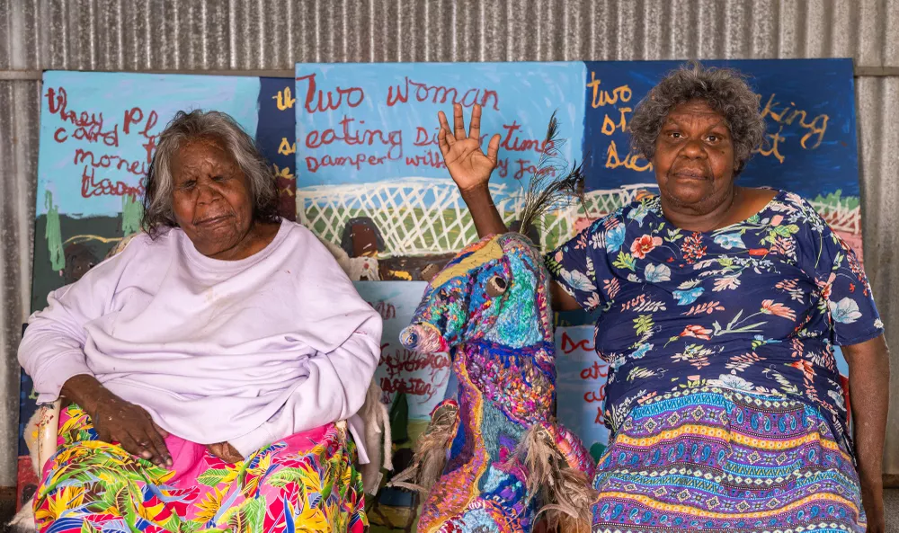 Sally is known for her figurative and naïve painting style that involves roughly-applied colours and cursive writing; Marlene on the other hand is acclaimed for her soft sculptures made from recycled bush-dyed woollen blankets and vividly-coloured thread.