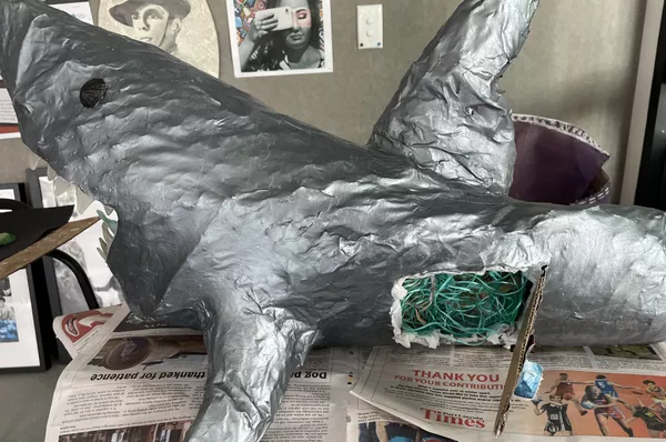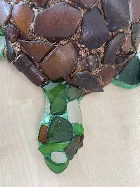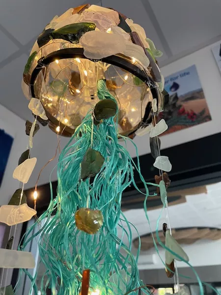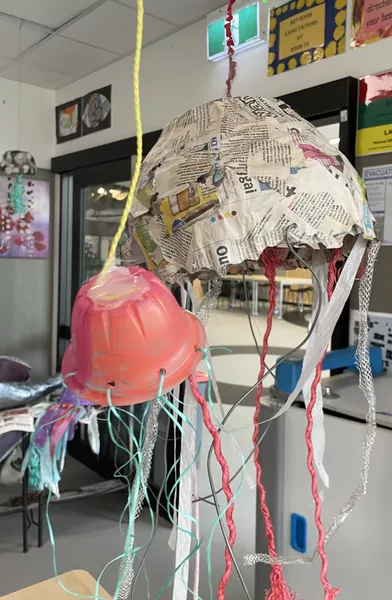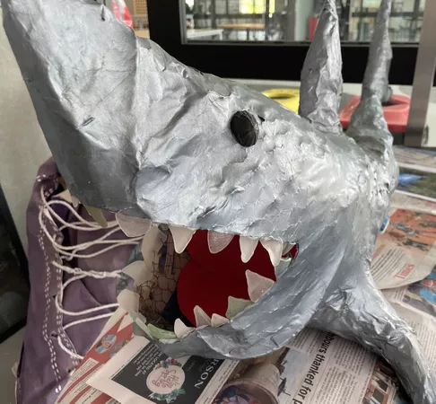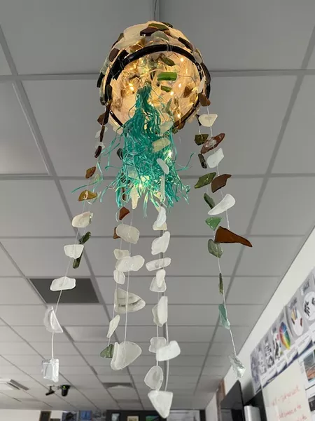 The students brainstormed issues that were impacting our local area in Port Lincoln. Plastic litter was raised but students noted that because supermarkets had banned plastic bags recently there had been a reduction of this type of rubbish on our beaches. However, other debris such as the turquoise plastic rope (seen in the Bruce the Shark sculpture) and sea glass is frequently found on beaches and prevalent in some areas close to town. Students created a sea creature endemic to the waterways around Port Lincoln, and by using the waste materials, highlighted how this unwanted material can impact our wildlife.