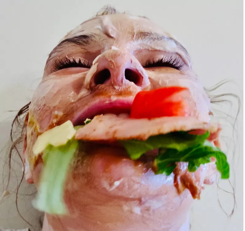Kit McNally, Kit-burger, 2020, sunscreen, facepaint, cheese, lettuce, tomato, bacon, sauce and mustard on Android phone