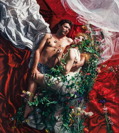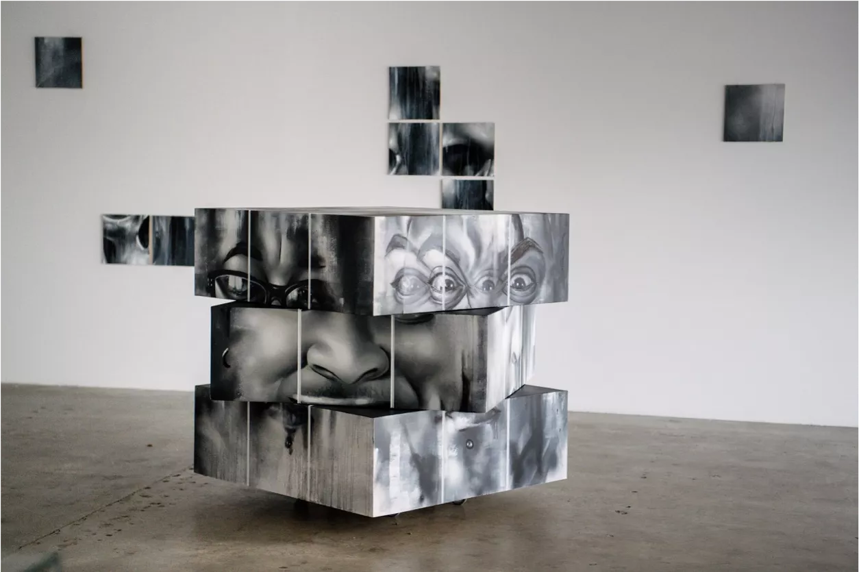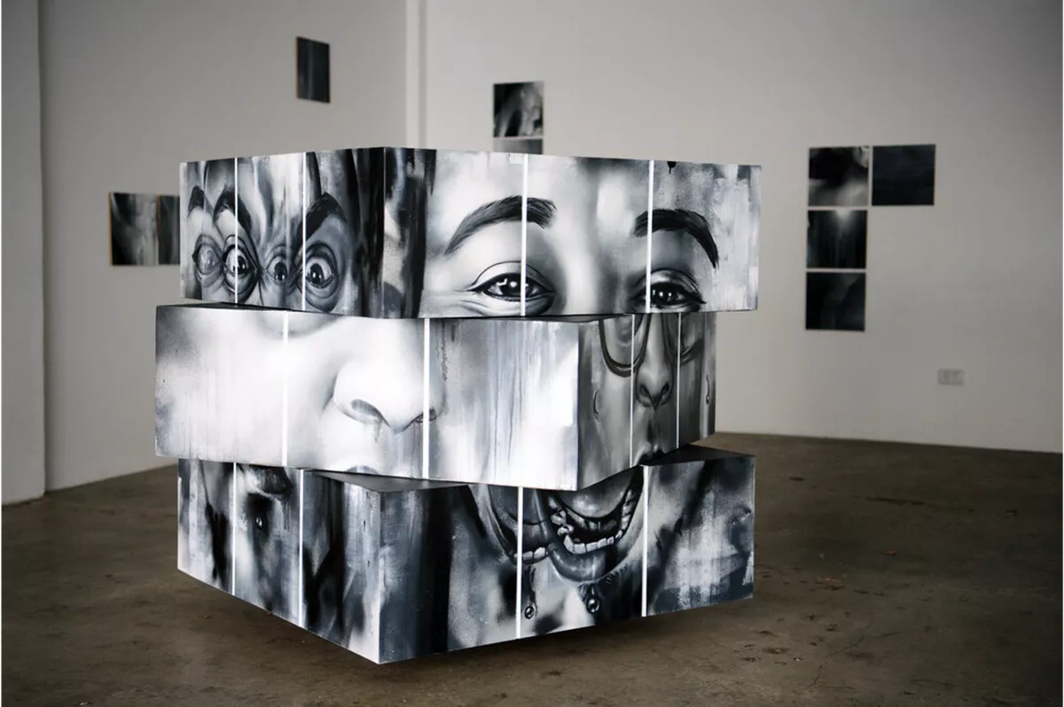 Thomas’ self-exploration and personal narratives become opportunities to reflect the wider world, through themes of love, loss, and grief. Thomas’ graphic aesthetic is powerfully rendered in black and white, with careful attention to detail. He melds street art style with classical training to produce work that is technical and conceptual. In his recent works he pushes his practice into 3D sculptural space, playing with the pictorial plane and interrupting our usual modes of interpretation.