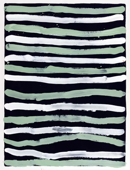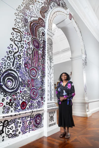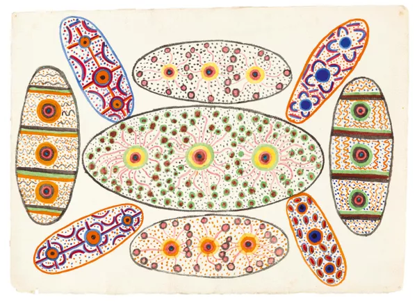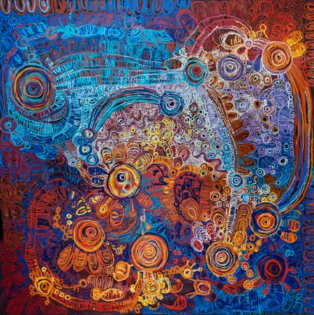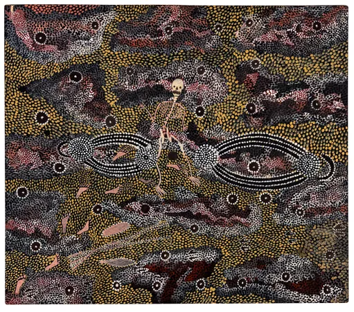 For centuries, Aboriginal and Torres Strait Islander peoples in various parts of Australia have used a dotting technique to share stories, either by drawing in the sand, painting on rock or as ceremonial body decoration. Artists in Papunya were using dots long before they began painting in 1971, along with many other forms of mark-making. Some sources will explain that dots are used to disguise secret/sacred cultural information, and this was true at a certain moment in the 1970s for a few artists who covered their entire canvas or board in dots. Most artists who use this technique today are located in the desert regions of Australia and this is the technique they use to share their ancestral creation stories. The dotting technique creates a sense of motion or pulsing in the artwork, with a decorative quality of sparkle and shimmer that many artists and collectors seek out. The dots themselves are not a sacred form of patterning, and there are some artists, whose work is purely commercial, who use dots so that non-Aboriginal and Torres Strait Islander peoples can easily identify their artwork as “Aboriginal”.