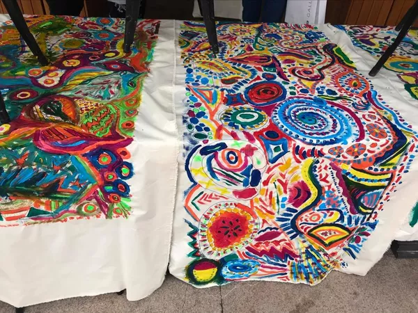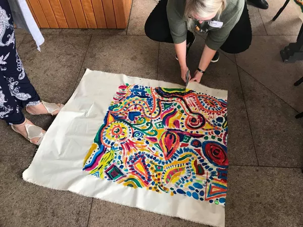 In this workshop Lee shared her story with teachers and highlighted her passion for collaboration in the arts and fashion industry. Teachers responded to a variety of music and worked collaboratively to create a fabric design which was later divided between the group.