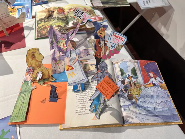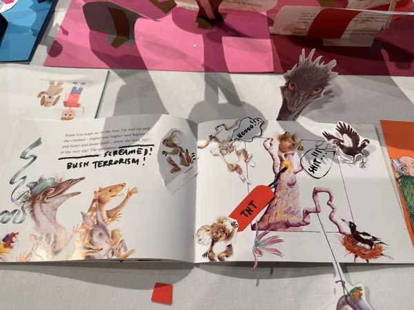 Educators then took a tour of Tarnanthi with Nici Cumpston and Gloria Strzelecki, followed by a strategy based session with Kylie Neagle. Here teachers examined the work of Vincent Namatjira and specifically the collaborative pop-up book collages he created with fellow artist Tony Albert. Teachers were then introduced to the 'starting with the artist' flowchart and brainstormed ways their students could respond to Namatjira's work, they then had a chance to modify their own children's book, inject some humour and improve the story. These books were donated by Oxfam but in a school setting teachers may like to photocopy books instead of modifying them in this way.