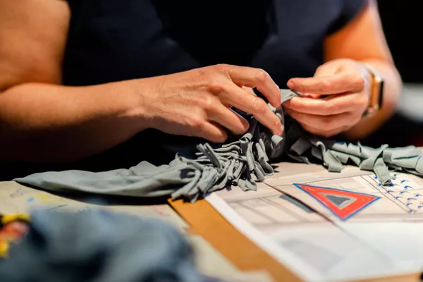 Teagan Cowlishaw delivered an artist talk, sharing stories about her early days of working as an artist on canvas, to today working as a designer and running her own fashion label Aarli. Cowlishaw discussed the importance of working in collaboration with other artists and designers and revealed that the opportunity to work as a producer at the Darwin Art Fair in 2019 for Country to Couture was a major career highlight. Passionate about sustainability, Cowlishaw shared strategies she is implementing within her own business to ensure the carbon footprint of her garments is minimal, including biodegradable packaging and up-cycling materials wherever possible. With this idea at the forefront, teachers up-cycled a t-shirt they brought from home, transforming it into a tote bag using a knotting technique and embellishing their new bag with a painted design of their choice.